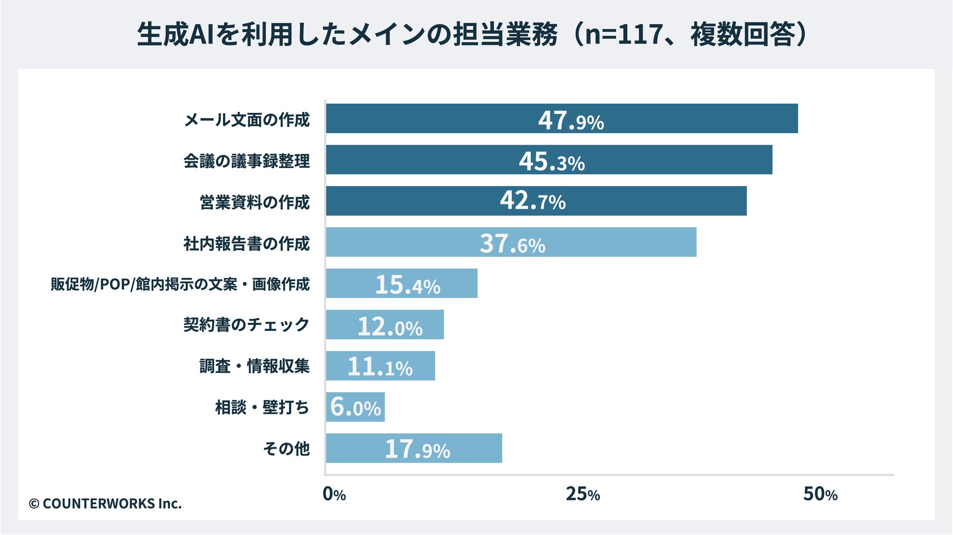 生成AIの活用効果については、生産性を「とても感じた」「まあまあ感じた」と回答した人が合計で88.0%に達しました。具体的には、メール、議事録、営業資料などにおいて、内容の要約や構成の整理、表現の調整といった“情報を整える”用途が中心です。生成AIが文案の骨格を提示し、担当者が内容を精緻化することで、仕上げまでのスピードを高める新しいワークフローが定着しつつある様子がうかがえます。