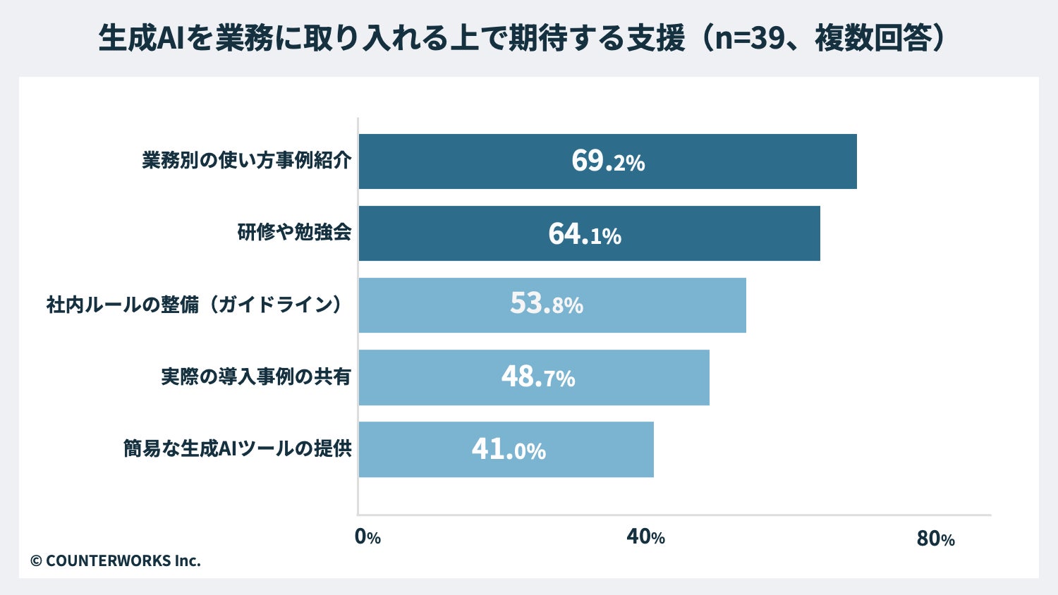 これは、多くの現場で「個人の試行」から「チーム単位での共有」へ移行できていないことが一因と考えられます。生成AIの活用を“属人的な工夫”に留めず、ナレッジとして蓄積・循環させる仕組みづくりが次の成長フェーズにおいて重要になります。