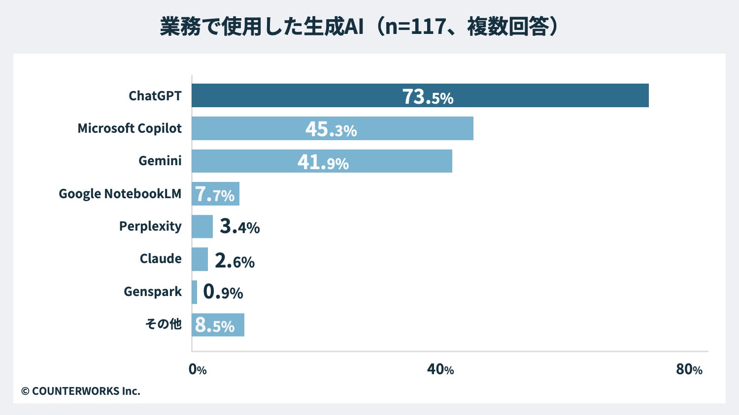 主に使われているツールは第1位「ChatGPT」(73.5%)、第2位「Microsoft Copilot」(45.3%)、第3位「Gemini」(41.9%)。