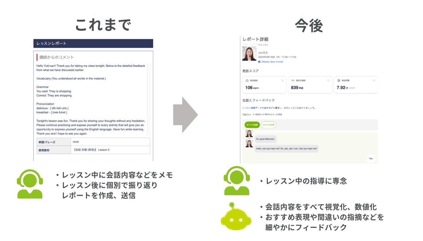 今回開発したのは、英会話レッスン後の復習を効率化し、学習効果を向上させる「AIレッスンレポートβ」です。レッスン中に録音された会話の音声をAIが文字起こし・分析を行い、発話内容のスコア化やおすすめの表現を提示し、レッスン後の復習をサポートします。これまで、レッスン中のフィードバックは、多すぎると会話が前に進まず、少なすぎても学びを得づらいという課題がありました。本機能を活用することで、レッスン中は受講者と講師共に会話に専念することができ、レッスン後も講師がフィードバックを行うための負担を減らすことが可能となり、学習体験の向上に繋がります。