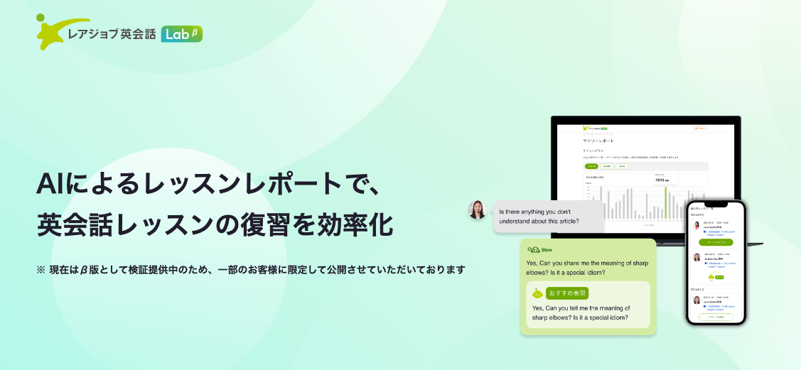 EdTechカンパニーの株式会社レアジョブ(以下、レアジョブ)は、生成AIアプリケーションの迅速な構築・拡張を支援する「Amazon Bedrock」を活用して英会話学習を効率化させる「AIレッスンレポートβ」をリリースし、「レアジョブ英会話」の一部の受講者から提供を開始いたしました。