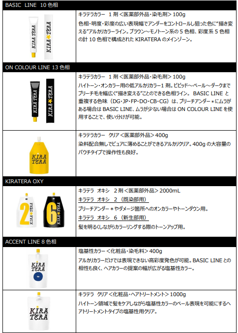 色相・明度・彩度の広い表現幅でアンダーをコントロールし狙った色に“描き変える”アルカリカラーライン。ブラウン~モノトーン系の5色相、彩度系5色相の計10色相で構成されたKIRATERAのメインゾーン。