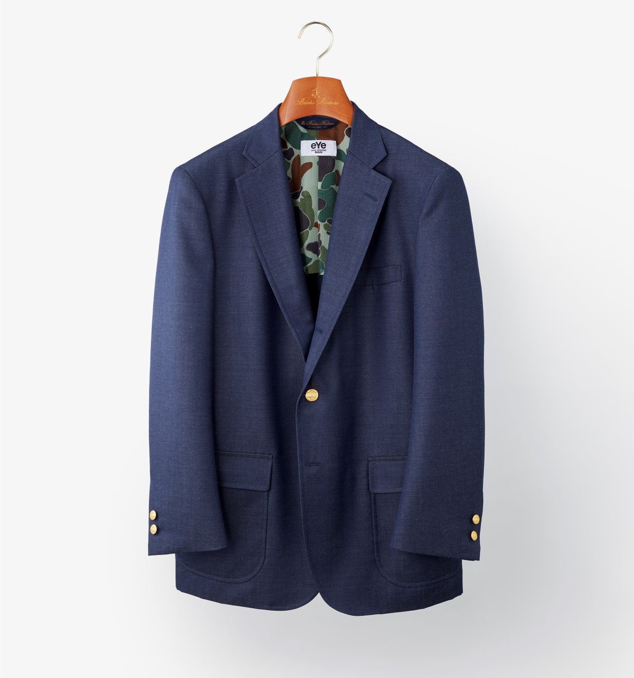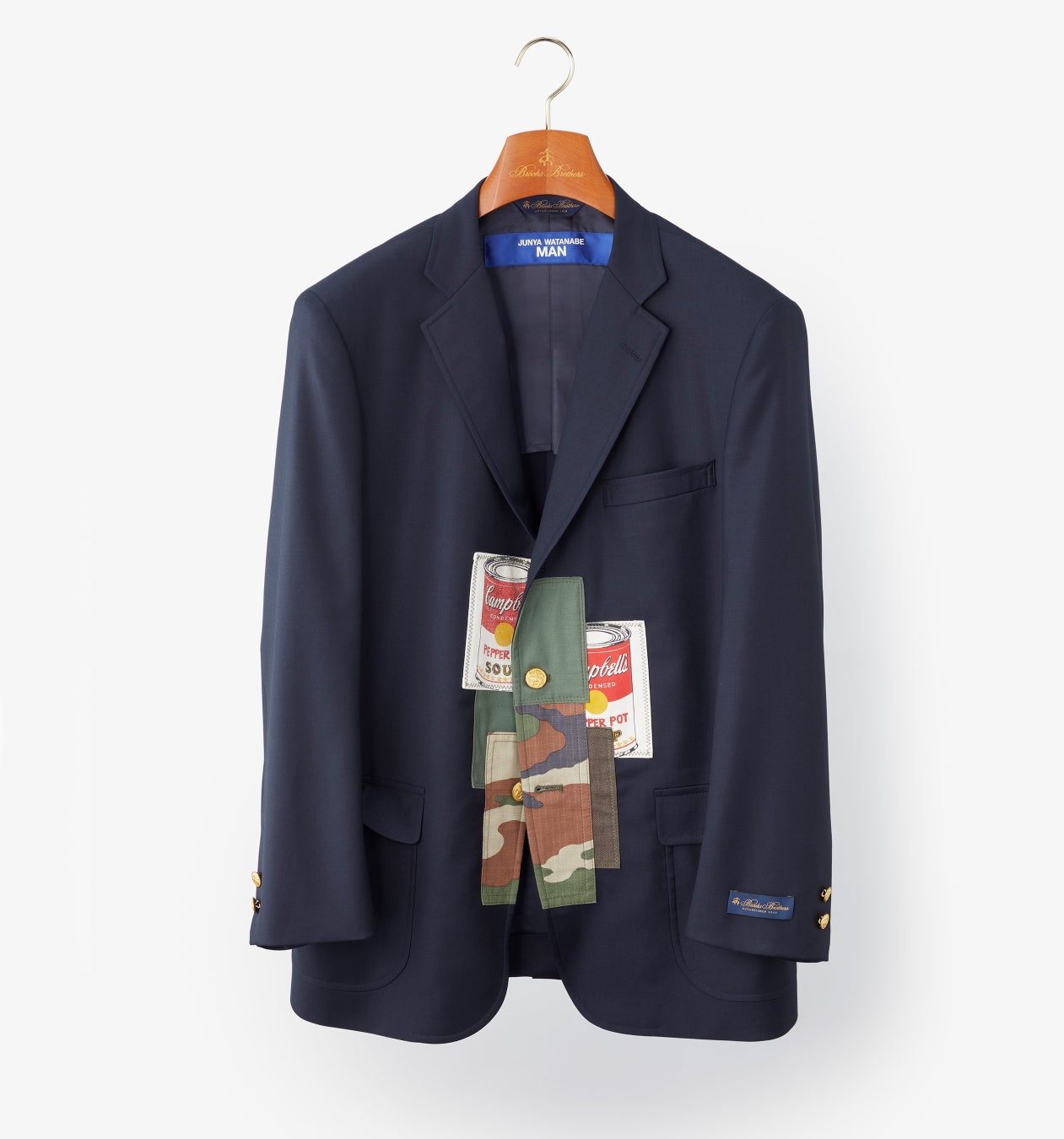 ブレザー2型は、マディソンフィットと呼ばれるブルックス ブラザーズの定番シルエットを採用。「ポップで価値のある洋服」をシーズテーマに掲げたJUNYA WATANABE MAN 2023年春夏メンズコレクションに登場したブレザーは、アメリカントラッドの王道である3釦段返りのサックモデルのネイビーブレザーのフロントに、ポップアートを代表するアーティスト、アンディ・ウォーホルの作品「Campbell’s Soup Can」をパッチワークに使用。カモフラージュとアメリカンポップアートとの相反するパターンによるミックスが特徴的な1着です。ウールモヘア混のツイル素材を使用したeYe JUNYA WATANABE MANのブレザーは、ブルックス ブラザーズの定番であるマディソンサックモデルをそのままに、裏地に大胆なミリタリーテイストのカモフラージュ柄メッシュをミックスさせました。