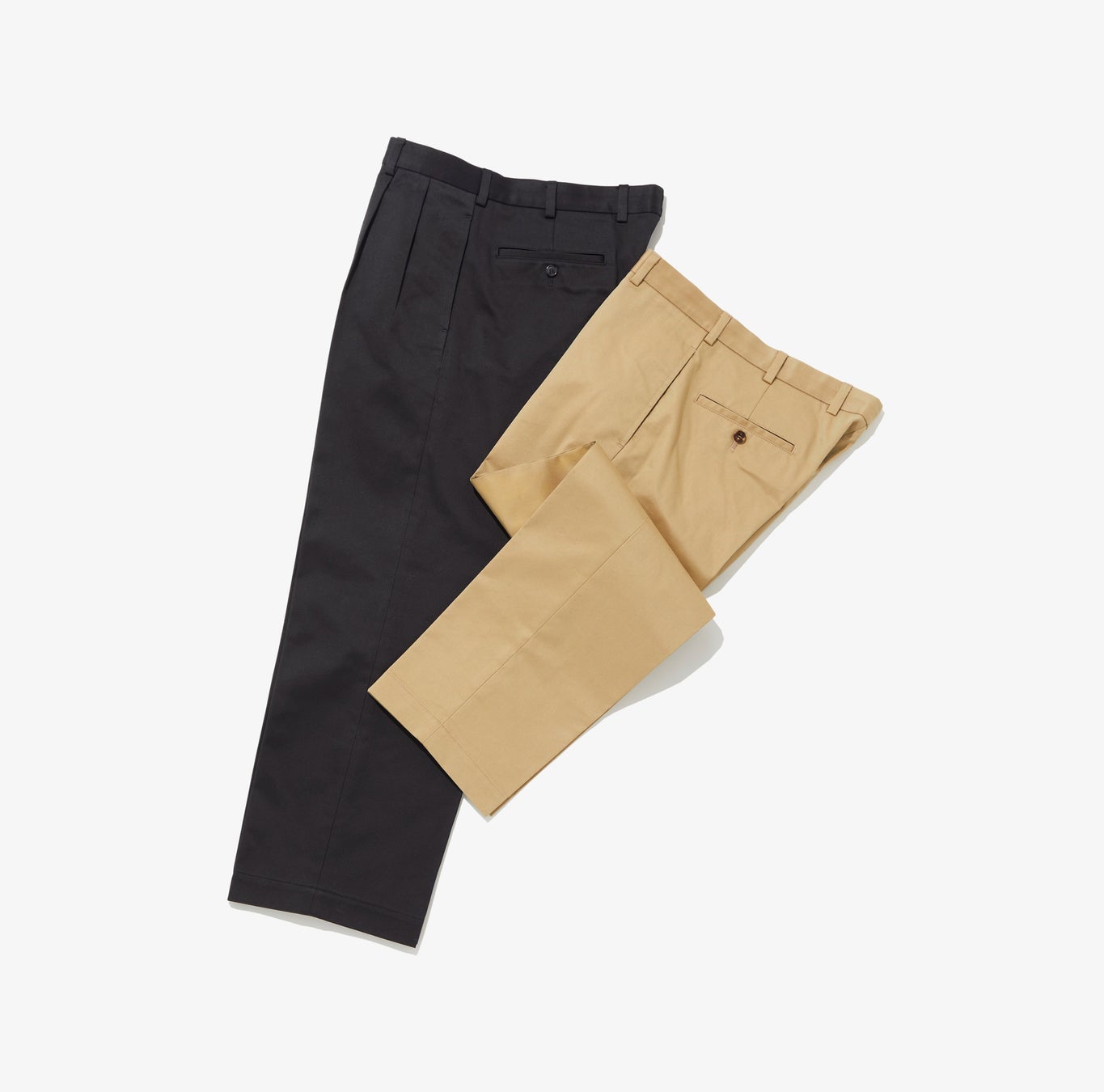定番のチノパンはすっきりしたノータック(クラーク)とワイドなツータック(エリオット)2つのシルエットに、高密度に織られたギャバジンやウエポン素材を使用した特別な仕上がりになっています。ウエスト内側はマーベルト仕様でブルックス ブラザーズのロゴを施したテープが使用されています。