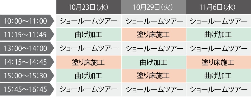 新商品・人気商品の施工方法や特性を実演しながらご説明します。普段は見る機会がない施工や加工の様子を間近でご覧いただけます。ショールームツアーの前後の時間で行ないますので、ぜひ併せてご参加ください。