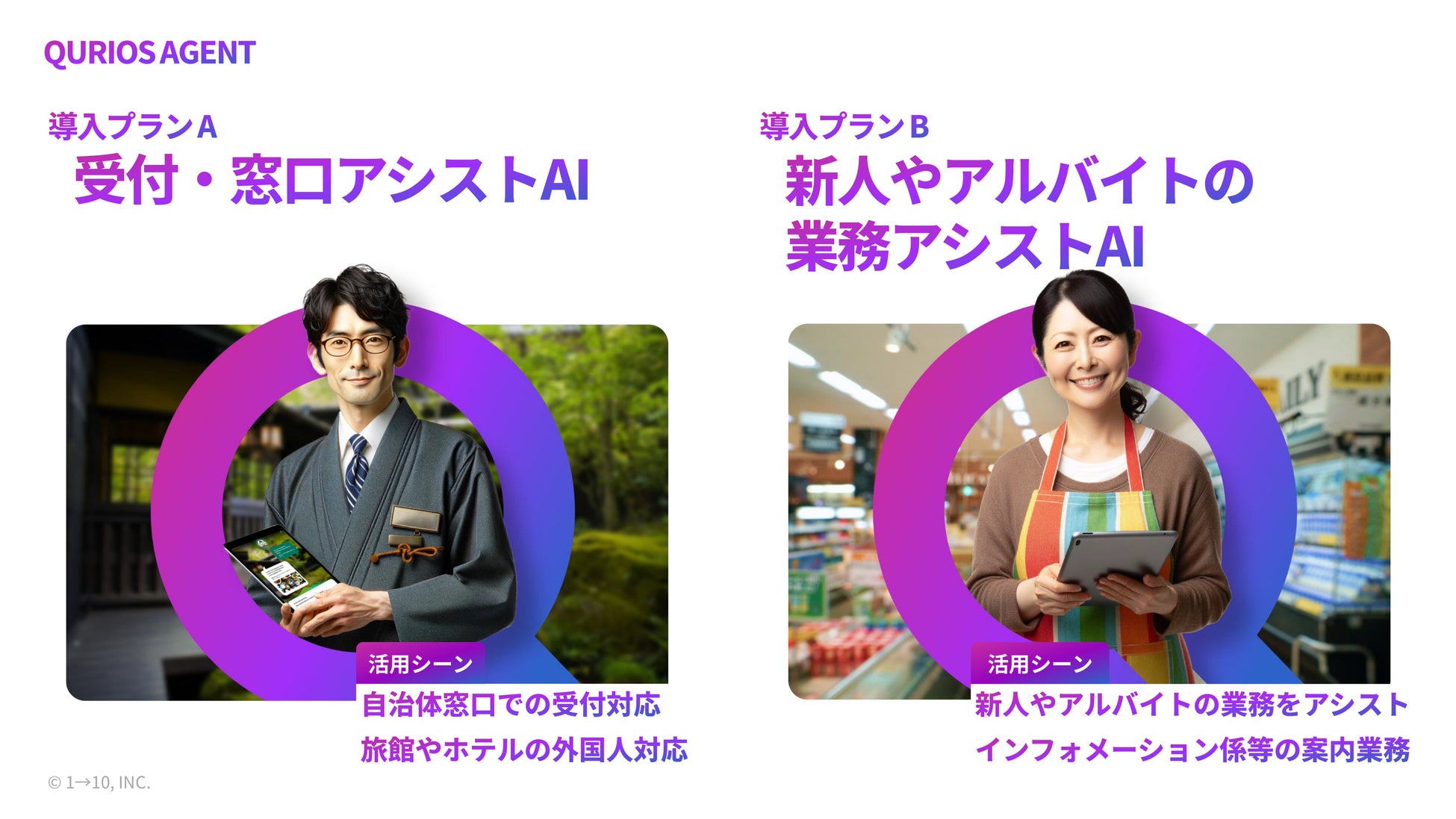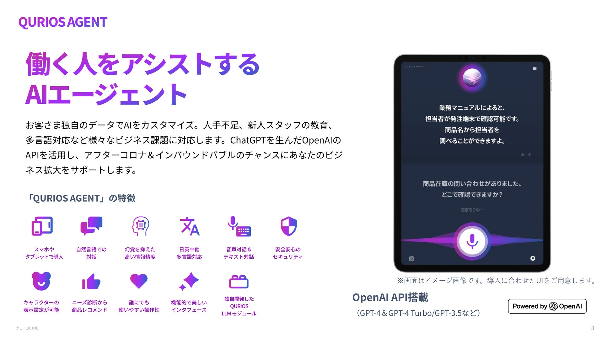 ワントゥーテンは、こうした社会課題・企業課題を踏まえ、受付・窓口業務や新人スタッフ教育や多言語対応などの企業の課題を生成AIの活用で解決する新事業を開始しました。この、「QURIOS AGENT」は、ChatGPTを生んだOpenAIのAPIを搭載し、顧客の持つ独自データからスタッフの業務遂行をアシストするオリジナルのAIエージェントを開発し提供するサービスです。