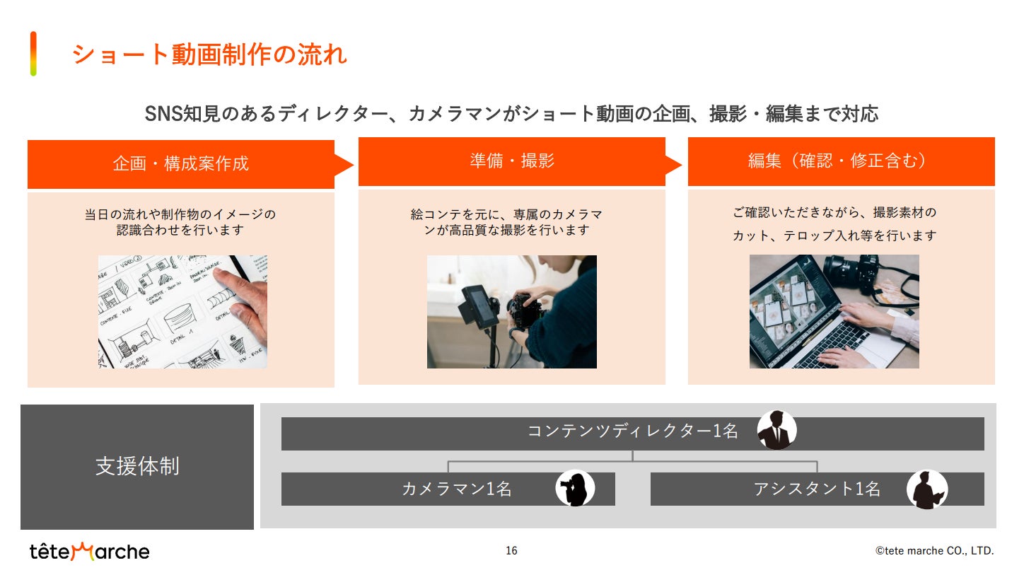テテマーチは、2015年の創業以来培ってきたSNS運用支援やブランドプロデュースなどのコミュニケーションプランニングのほか、SNS分析ツールの「SINIS for Instagram」「SINIS for X」の提供など、SNSを基軸とした支援事業を多数展開してまいりました。2024年6月からはショート動画の撮影~編集~納品までを1日で完結する「ショート動画当日納品プラン」の提供を開始し、スピーディーな動画制作支援で企業の効率的なSNS運用を支援しています。