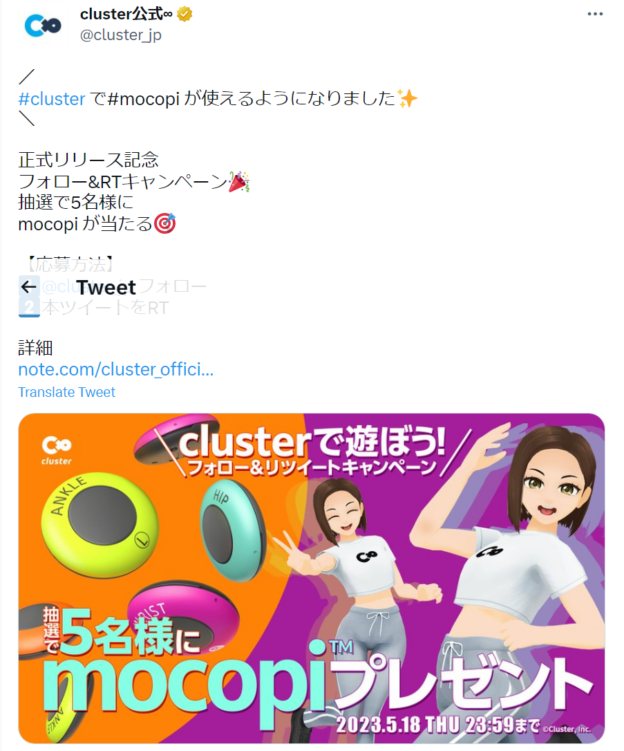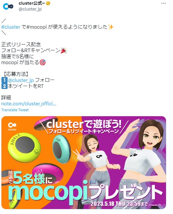 本アップデートを記念して、 cluster公式(@cluster_jp)をフォローし、投稿されるツイート(以下、本ツイート)をリツイートすると、抽選でmocopi™が5名様に当たるキャンペーンを開催します!