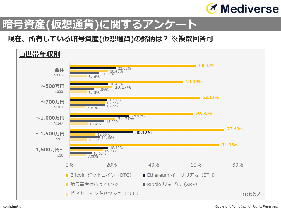 所有者のうち、6割以上が「Bitcoin(ビットコイン/BTC)」と回答