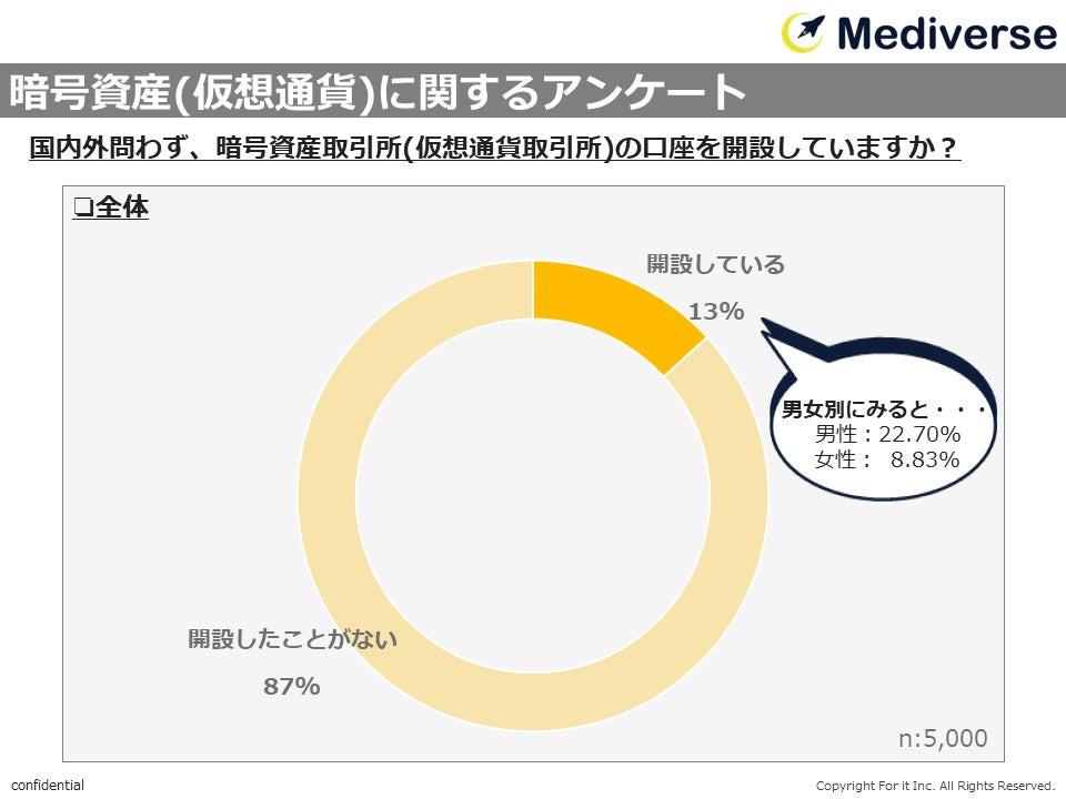 ・全体の13%が、「暗号資産取引所(仮想通貨取引所)の口座を開設している」と回答