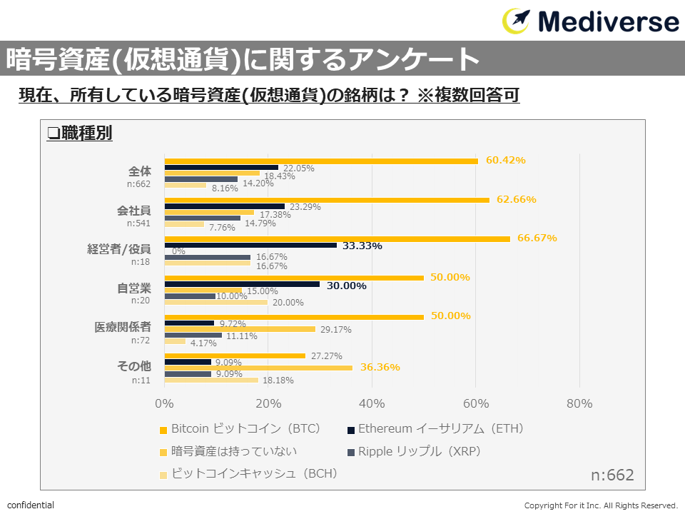 ・いずれの職種も「Bitcoin(ビットコイン/BTC)」がシェアを占めているが、「Ethereum(イーサリアム/ETH)」は経営者/役員33.33%、自営業30.0%と他職種より割合が高い傾向にあった