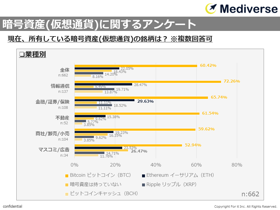 ・いずれの業種も「Bitcoin(ビットコイン/BTC)」が過半数を占めており、「Ethereum(イーサリアム/ETH)」と回答した割合がもっとも高かったのは金融/証券/保険29.63%、「暗号資産(仮想通貨)は持っていない」と回答した割合がもっとも高かったのはマスコミ/広告26.47%だった