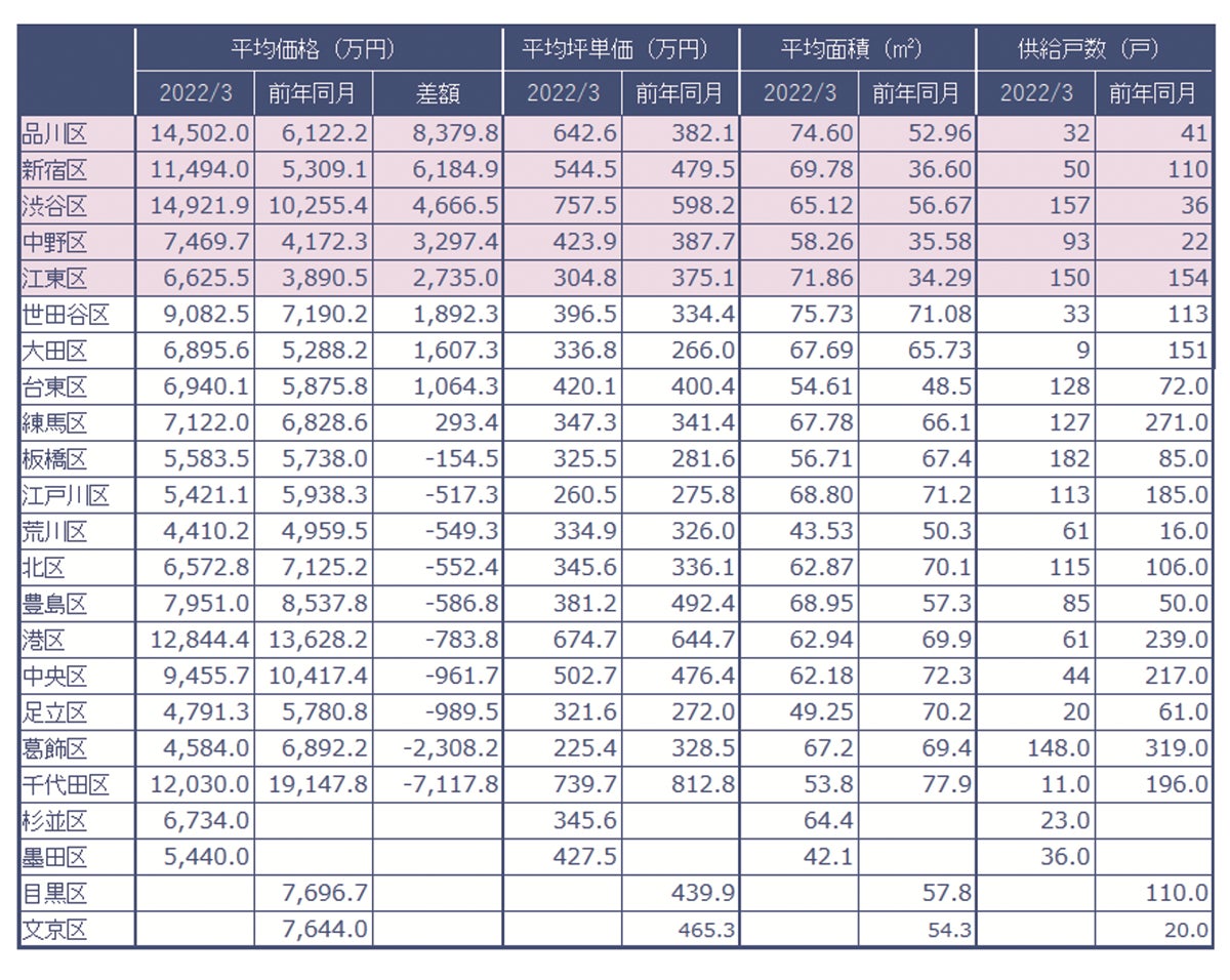 当社調べの2022年3月度東京23区別速報値分譲実績データです。