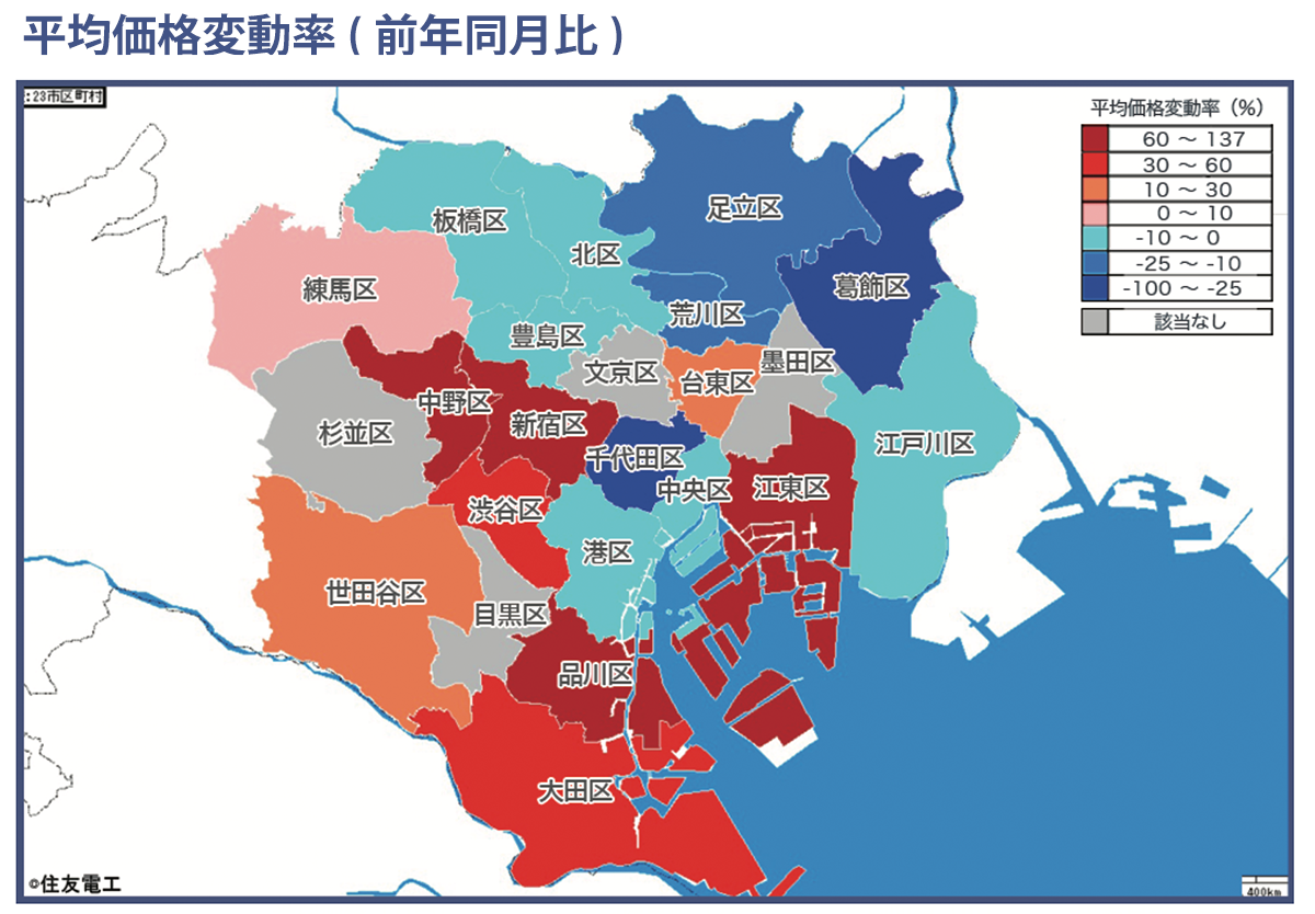 東京23区の平均価格・平均坪単価・平均面積・供給戸数を前年同月値と共に表にまとめ、平均価格の前年同月比で平均価格変動率を算出、ポリゴン表示しました。