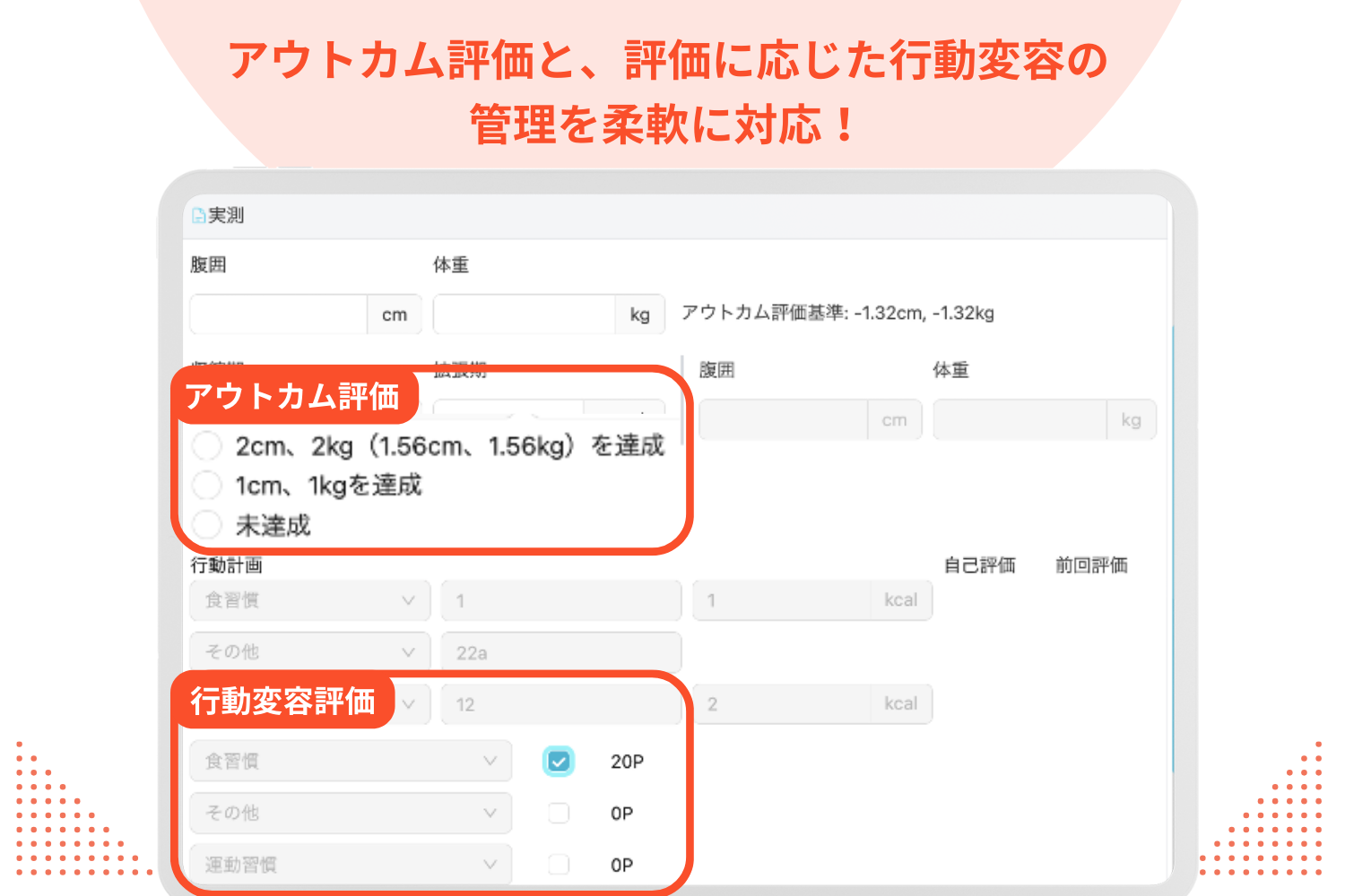 「カロミル保健指導」では、第4期特定保健指導より必要となるアウトカム評価の達成状況に合わせて、達成数値が自動選択されるため、評価時のミスを軽減できます。さらに、行動変容においては、評価項目として掲げられている5項目について評価ができる仕組みとなっており、初回面談時に設定した行動計画の大項目が自動で反映されます。
