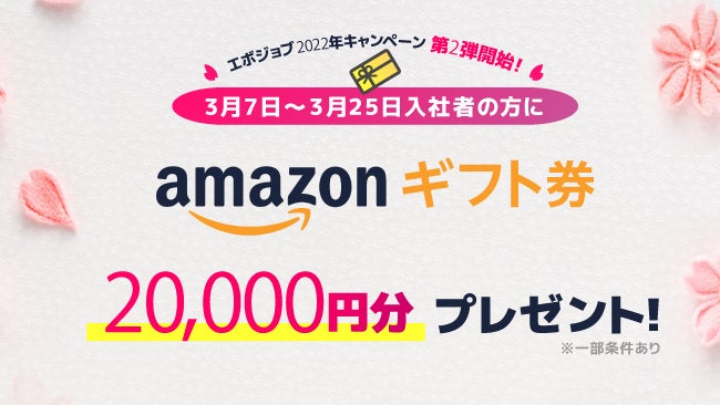 3月25日までの入社者にAmazonギフト券2万円分をプレゼント ~エボジョブ2022年キャンペーン第二弾「ハタラク×新生活応援」開始