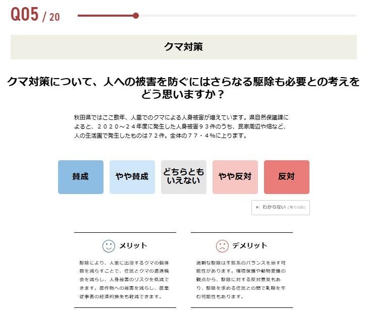 今回の県知事選の「争点」として挙げられている「佐竹県政の重点施策」「クマ対策」「洋上風力発電を生かした産業振興」など幅広い分野の設問になりますが、全ての質問に概要を説明する「解説文」と「メリット」「デメリット」を記載することで、利用者の判断材料をご提供します。
