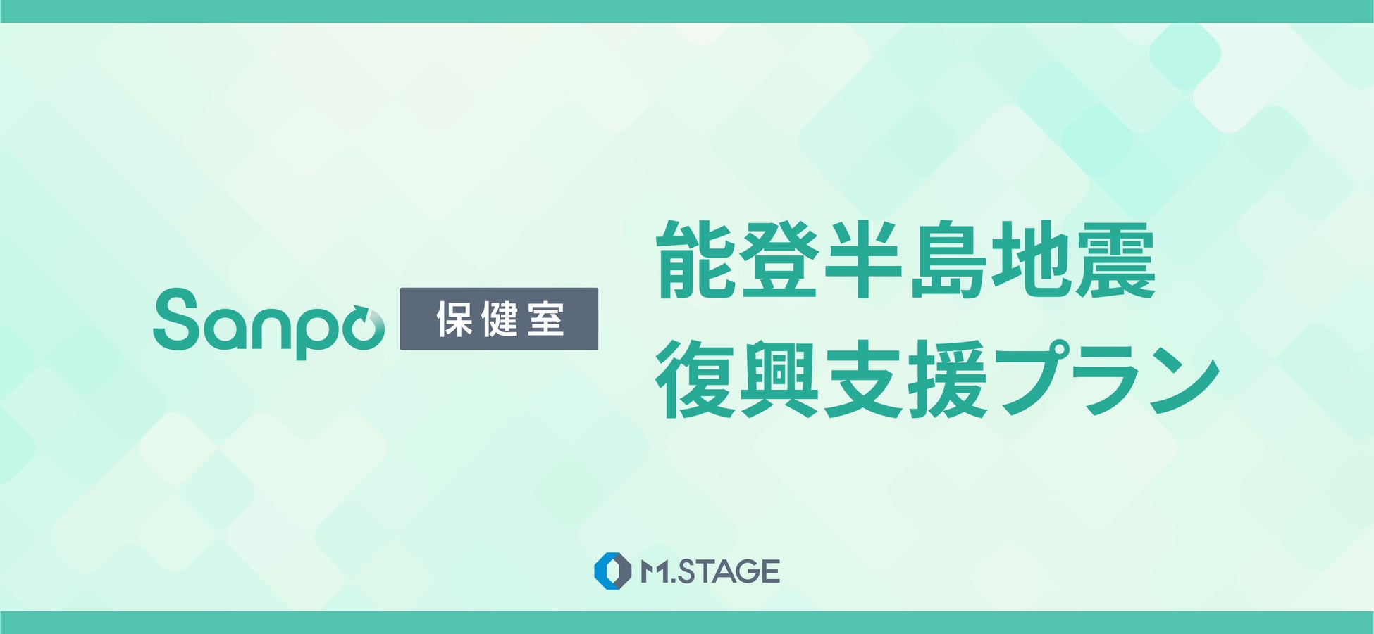 この度、エムステージは、令和6年能登半島地震により被災された企業を対象に、『Sanpo保健室』を無償でご利用いただける「能登半島地震 復興支援プラン」の提供を開始いたします。専門家による面談を従業員に受けてもらうことで、従業員のメンタルヘルスをケアしたり、人事労務として対応しなければならない事象へのアドバイスをもらったりなど、被災に伴う企業のヘルスケアの対応にお役立てください。