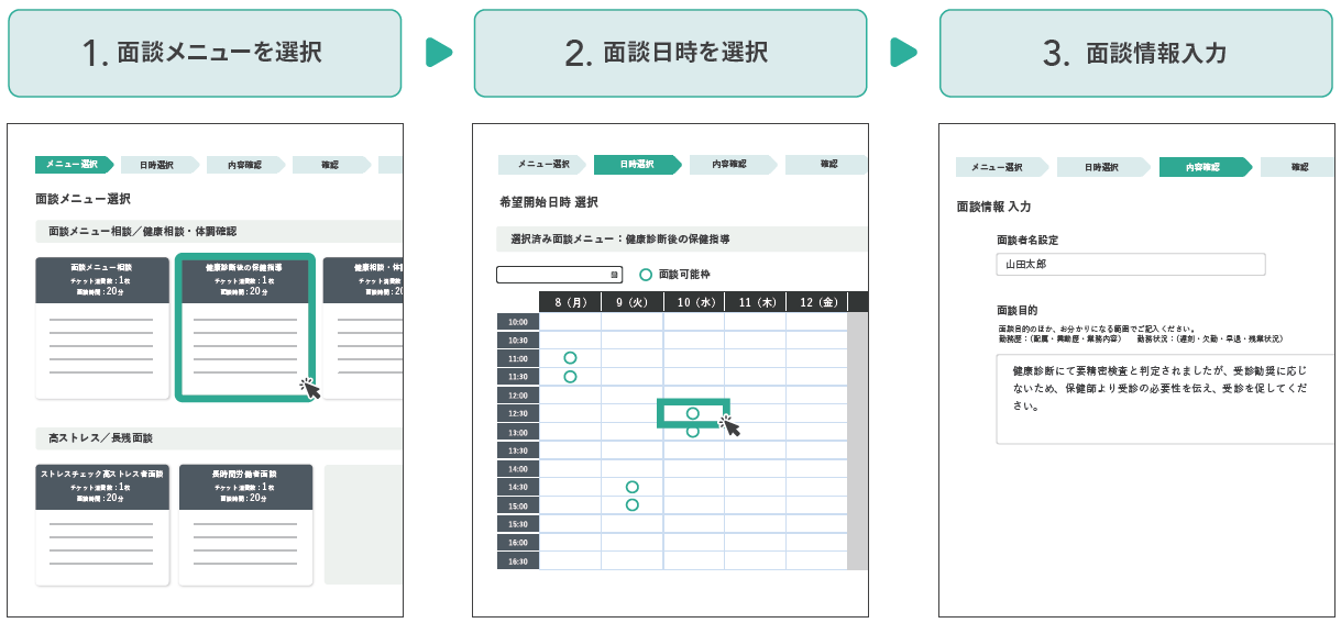 面談予約は3ステップで完結します。面談前に必要情報・資料を登録します。