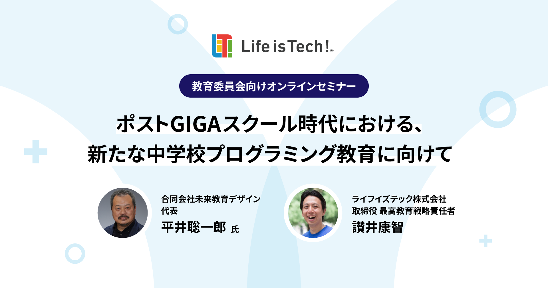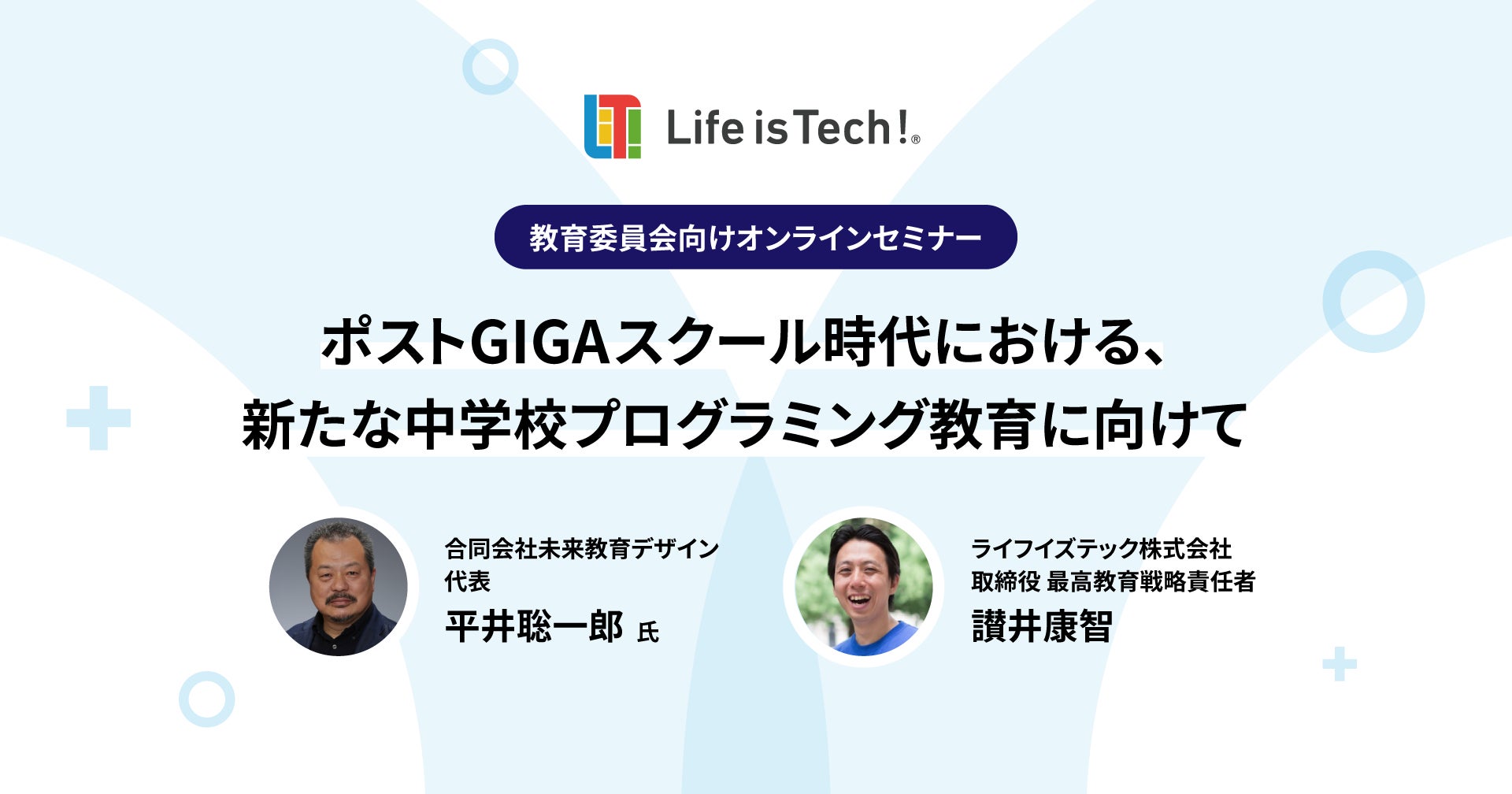 プログラミング教育サービス事業を手がけるライフイズテック株式会社(本社:東京都港区、代表取締役CEO:水野 雄介)は、教育委員会の方々に向けたオンラインセミナー「ポストGIGAスクール時代における、新たな中学校プログラミング教育に向けて」を、文部科学省ICT活用教育アドバイザーや経済産業省未来の教室評価・検討会議委員を務めておられる平井聡一郎先生をお招きし、2月22日に開催いたしました。