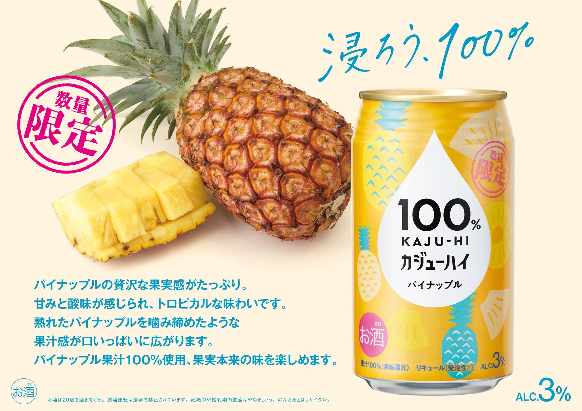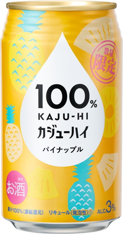 『100% カジューハイ』は果実のめぐみ(濃縮果汁)をお酒で割るから「カジューハイ」と名付けられた、新しいカテゴリーのお酒です。果汁100%だから味わえる果実本来の豊かなめぐみと、アルコール度数3%の程よいアルコール感が特徴です。酔いすぎないから心地よくリラックスでき、果汁100%だから果実本来の美味しさが味わえる、リラックス感と贅沢さを融合させた特別なお酒です。自分の時間を自分らしく楽しむ新しいアルコールユーザーのニーズに応えて開発されました。今回は、数量限定で〈パイナップル〉フレーバーを発売することで、同ブランドのさらなるファン拡大を図ります。