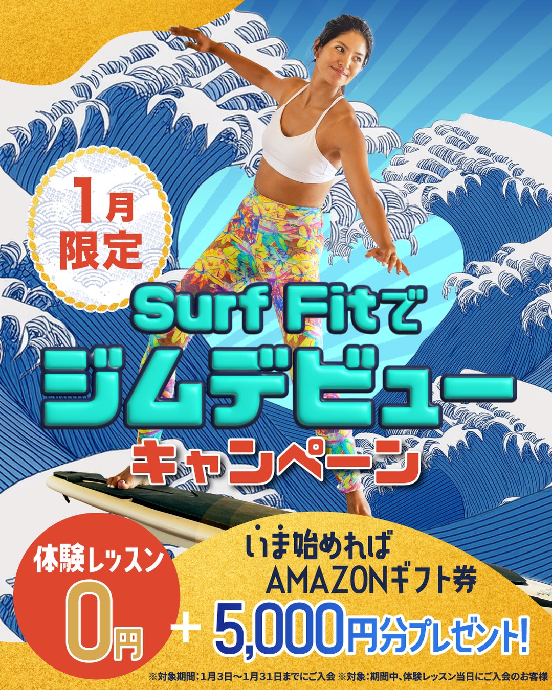 『人生を、愛そう。』を企業スローガンに掲げ、全国に130店舗以上の女性専用のブティックフィットネスジムを展開する株式会社LIFE CREATE(本社:北海道札幌市、代表取締役:前川 彩香、以下、LIFE CREATE)が運営するサーフエクササイズスタジオ『Surf Fit』では、新しい年を迎え、健康やフィットネスに挑戦したいと思っている方にぴったりのジムデビュー応援キャンペーンを実施いたします。期間中、体験レッスン当日にご入会いただいた非会員の方には、Amazonギフト券5,000円分をプレゼントし、ジムデビューを決意した女性を応援します。