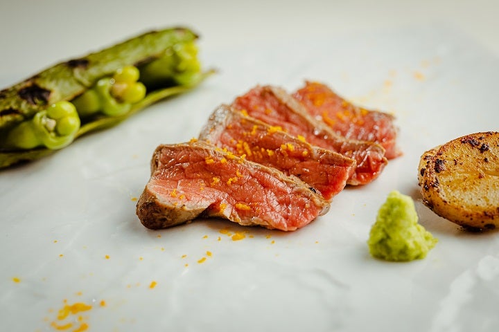 鹿児島黒牛内もも味噌󠄀柚庵焼き 焼そら豆 新ジャガイモ味噌󠄀バター 山葵