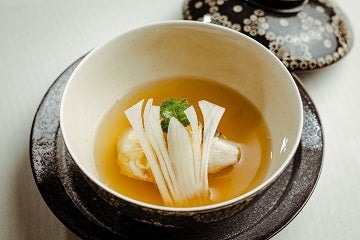 旨味をシンプルに味わっていただけるように鯛をふっくらと酒蒸しにし、五月らしくあやめに見立てた独活を添えました。こだわりの一番出汁と共にお召し上がり下さい。