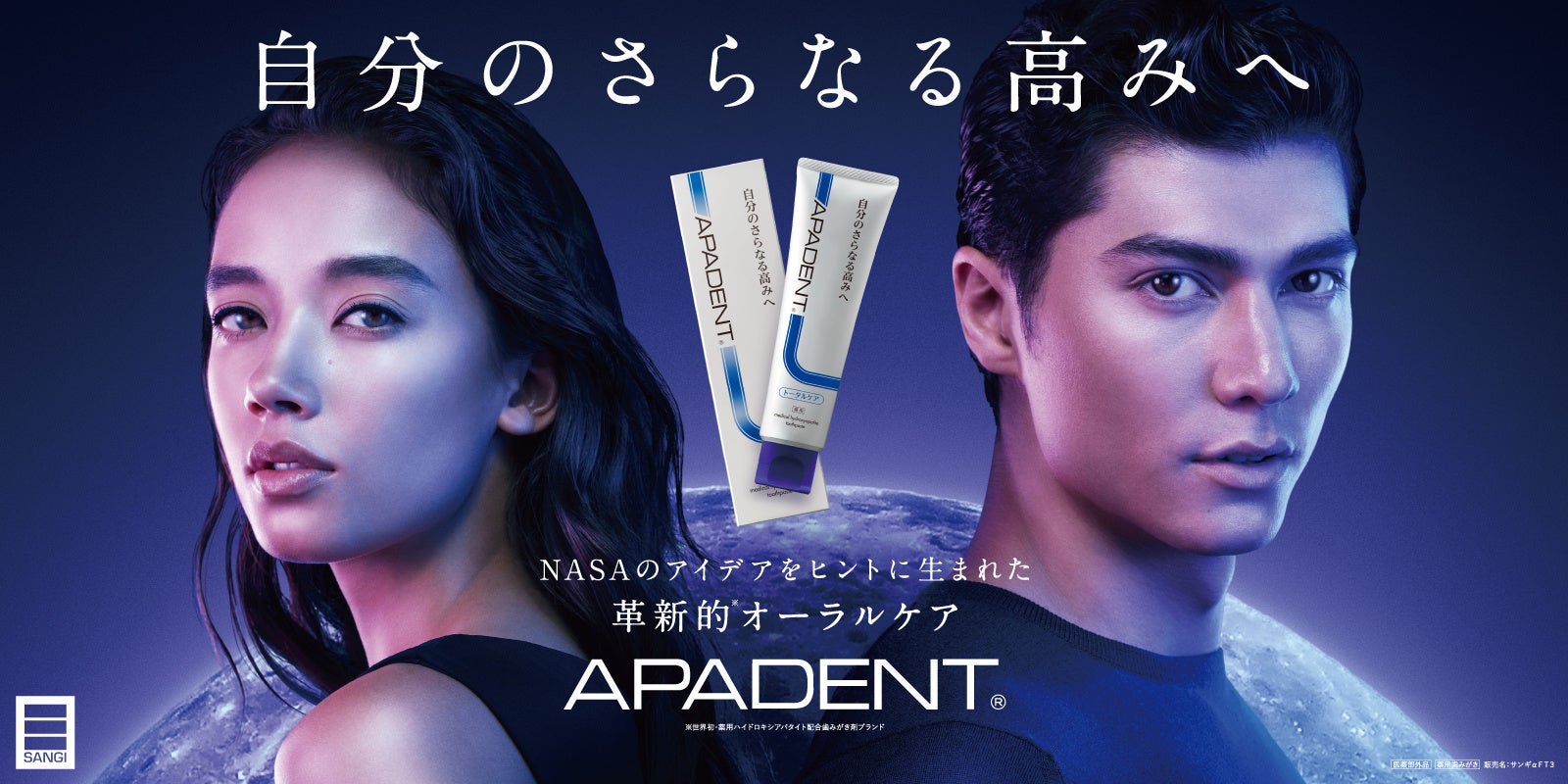 歯みがき剤「アパデント」は、NASAのアイデアをヒントに生まれた革新的*オーラルケアブランド。本商品には、歯垢を吸着除去し、ミネラルが溶け出したエナメル質の欠損部に成分補給して修復・再石灰化という3つの作用でエナメル質を整え、むし歯を予防してくれるサンギ開発の独自成分「薬用ハイドロキシアパタイト」を配合しています。「アパデント トータルケア」はむし歯・歯周病*3・口臭を予防し、オールラウンドのケアを。また、歯周病*3を予防したい方には「アパデント 歯周ケア」、口臭ケアしたい方には「アパデント ピュアブレス」がおすすめです。