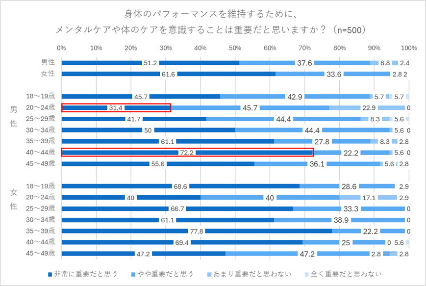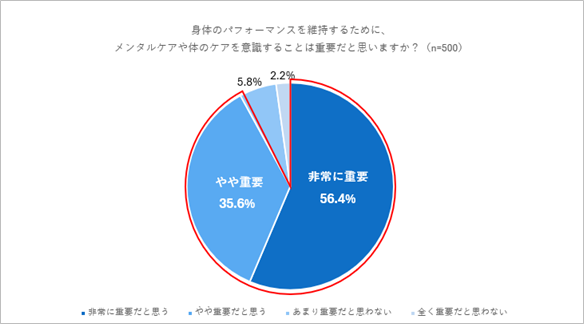 こうした不調に対して、身体のパフォーマンスを維持するために、「メンタルケアや体のケア」については、全体の92.0%が重要である(非常に重要:56.4%、やや重要:35.6%)と回答しました。