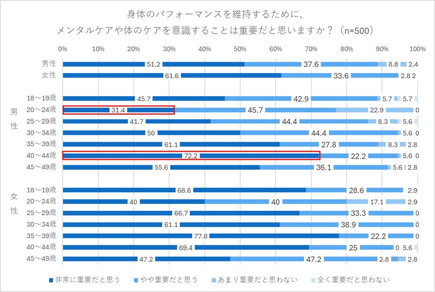特に30代後半の女性(77.8%)や40代前半の男性(72.2%)において「非常に重要」とする回答が突出しており、日々のコンディション管理に対する高い意識が伺えます。一方で、20代前半男性の層は「非常に重要だと思う」が31.4%に留まり、世代間での意識のギャップが顕著に現れる形となりました。