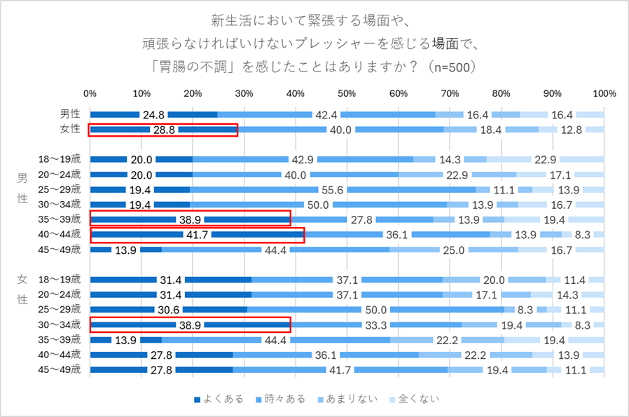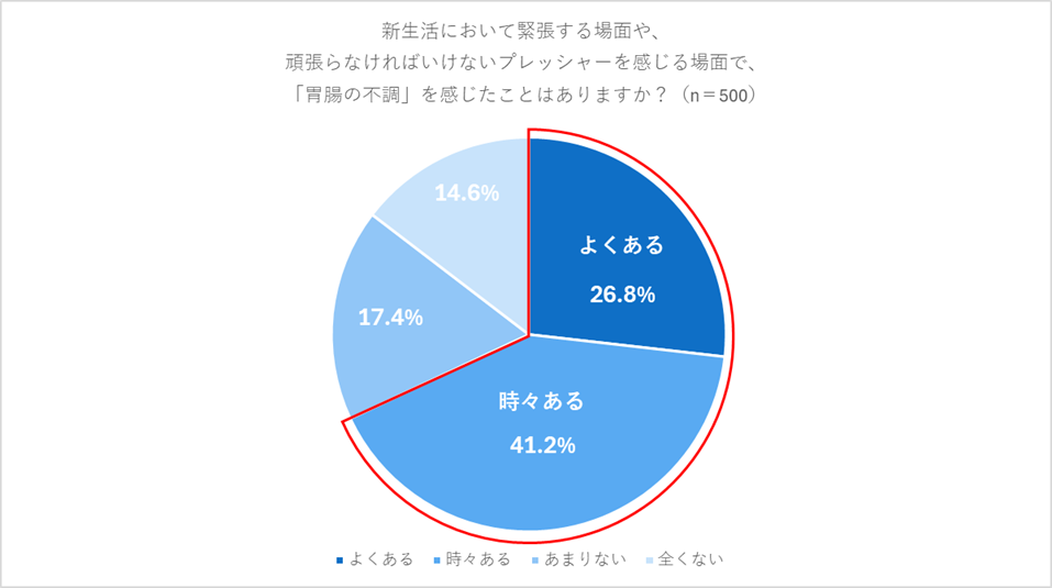 まず、新生活における緊張やプレッシャーを感じる場面で「胃腸の不調」を感じたことがあるかを尋ねたところ、「よくある(26.8%)」と「時々ある(41.2%)」を合わせて、全体の68.0%が胃腸の不調を経験している実態が明らかになりました。