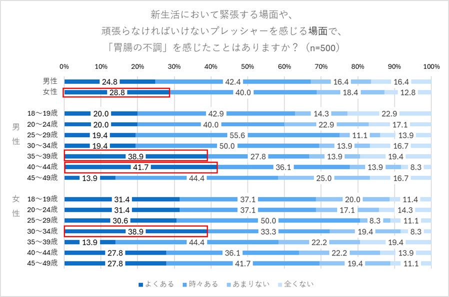 性別で見ると、女性の方が28.8%(「よくある」回答)と頻度が高い傾向にありますが、年代別で最も割合が高かったのは40代前半の男性(41.7%)でした。次いで30代後半男性(38.9%)や30代前半女性(38.9%)も高く、仕事や家庭での役割が増えやすい世代であるミドル層が、新生活のストレスを身体的に受けやすい実態が浮き彫りとなっています。