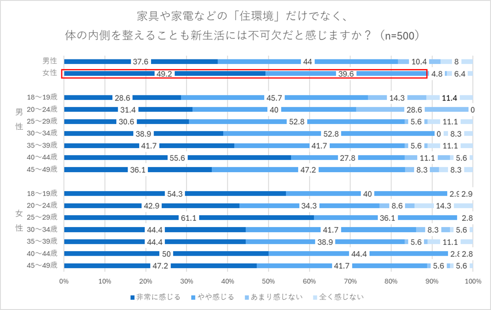 特に女性においては約9割(88.8%)が不可欠と回答しており、もはや家具や家電を揃えるのと同等のレベルで、食事や水を通じた「インナーケア」が新生活の準備における「新常識」として定着している実態が浮き彫りとなりました。
