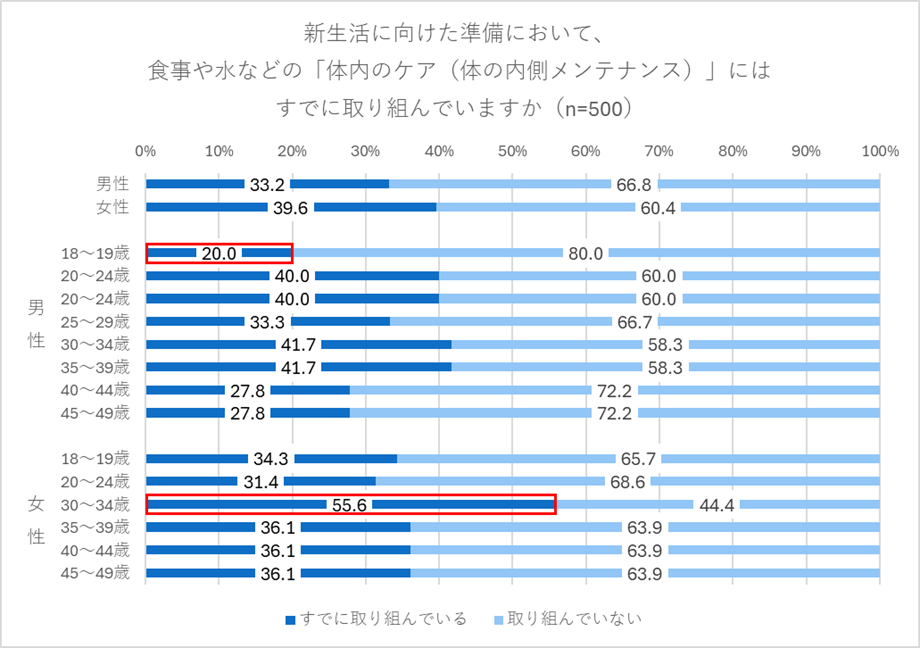 しかし、食事や水などの「体内のケア(体の内側メンテナンス)」に既に取り組んでいるかを確認したところ、重要性を認識している一方で、「既に取り組んでいる」割合は全体で4割に満たない結果でした(男性:33.2%、女性:39.6%)。