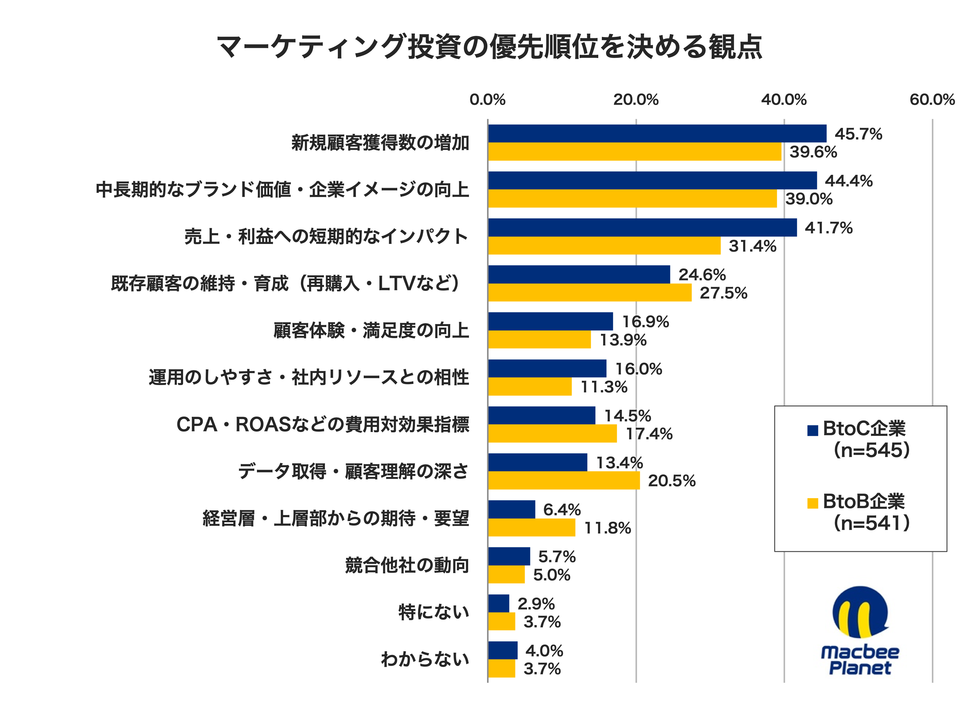 マーケティング投資の優先順位を決める観点では、BtoC企業は“新規顧客獲得数の増加”(45.7%)、“中長期的なブランド価値・企業イメージの向上”(44.4%)、“売上・利益への短期的なインパクト”(41.7%)が上位でした。