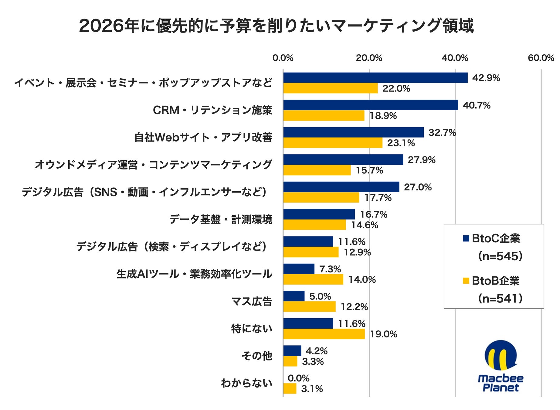 「優先的に削りたい予算」では、BtoC企業で“イベント・展示会・セミナー・ポップアップストアなど”(42.9%)が相対的に高く、BtoB企業(22.0%)を上回りました。BtoC企業は“CRM・リテンション施策”(40.7%)も高めで、配分見直しの対象になりやすい領域が上位になりました。