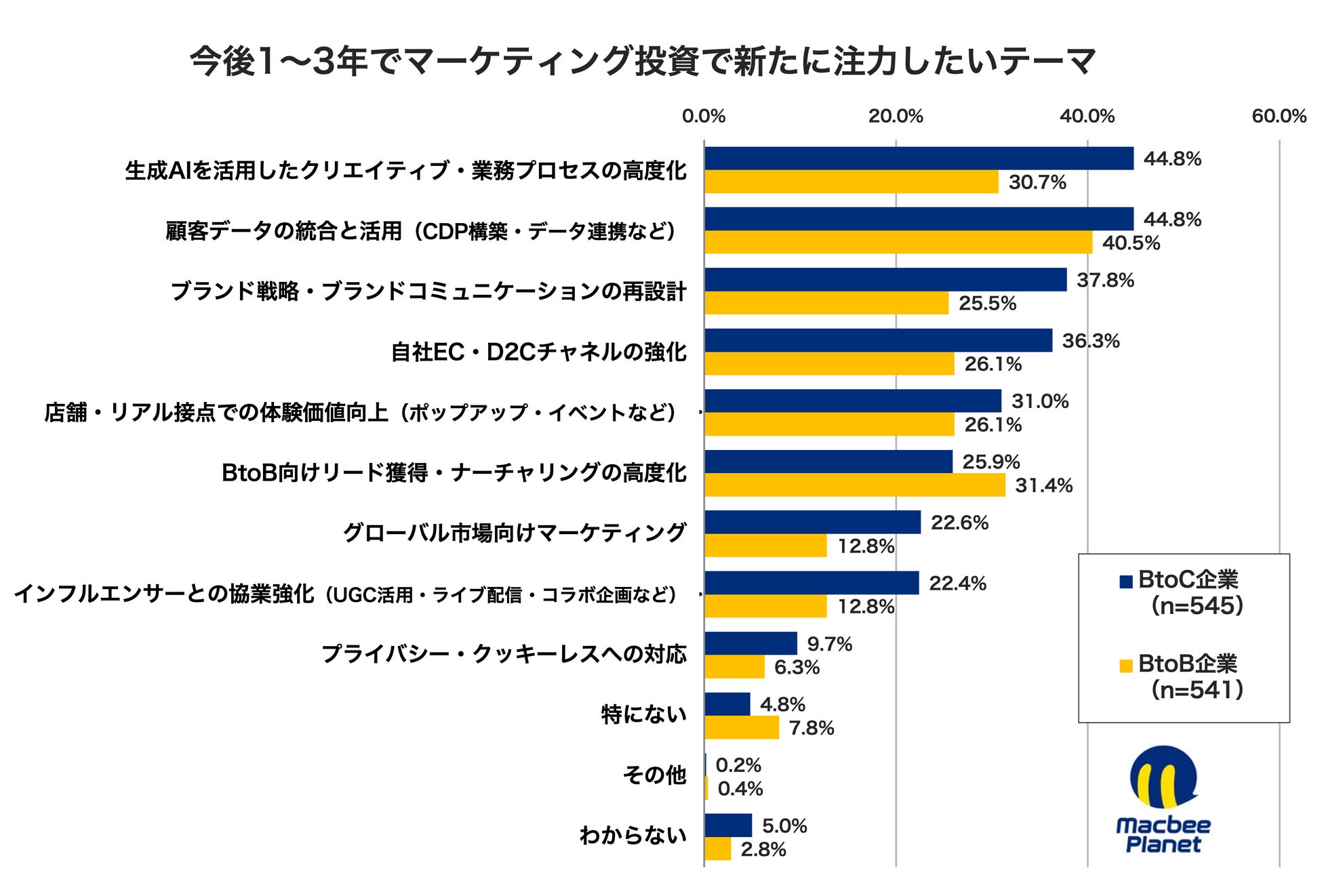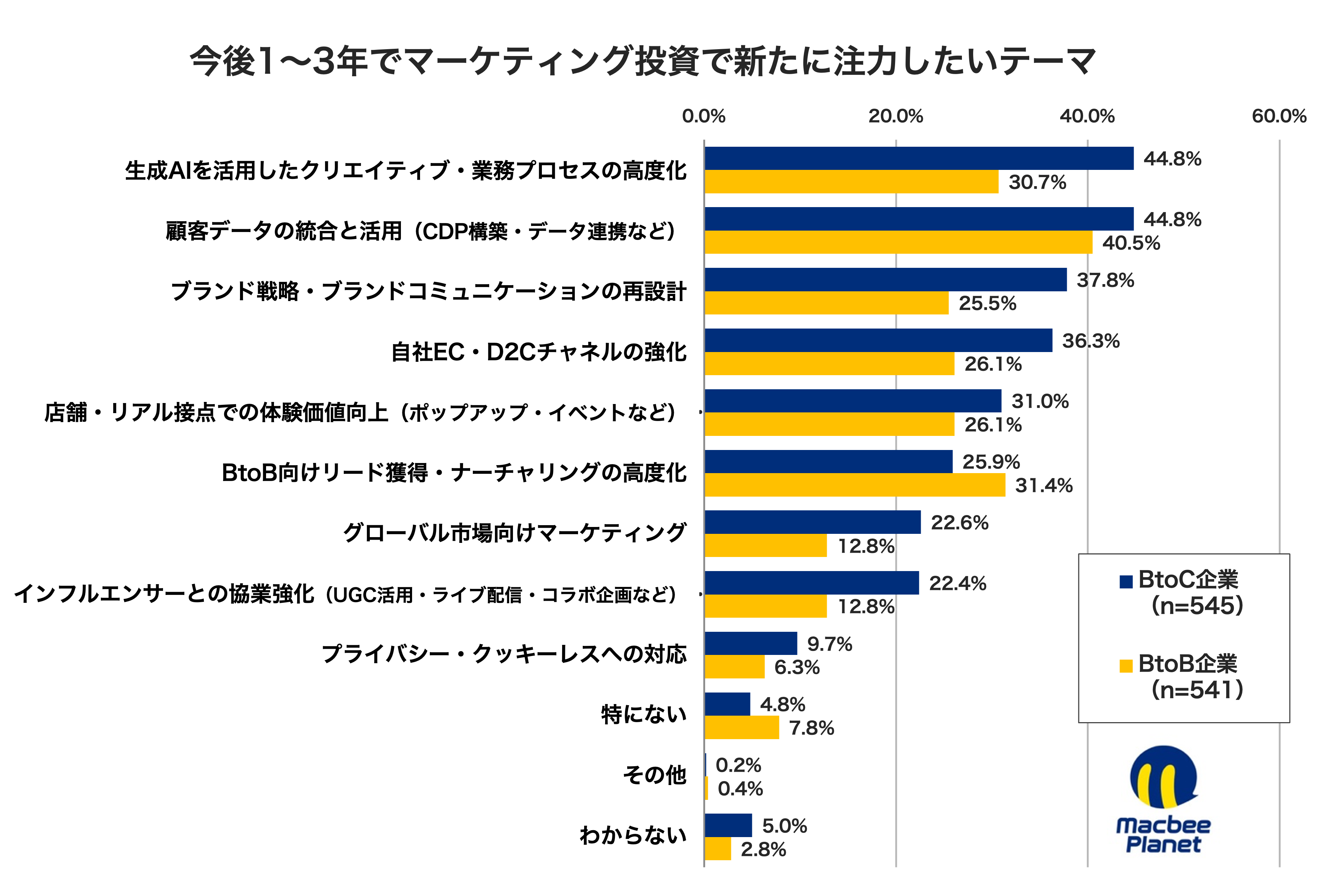 今後1〜3年で新たに注力したいテーマでは、BtoC企業で“生成AIを活用したクリエイティブ・業務プロセスの高度化”(44.8%)、“顧客データの統合と活用”(44.8%)が同率で上位となりました。