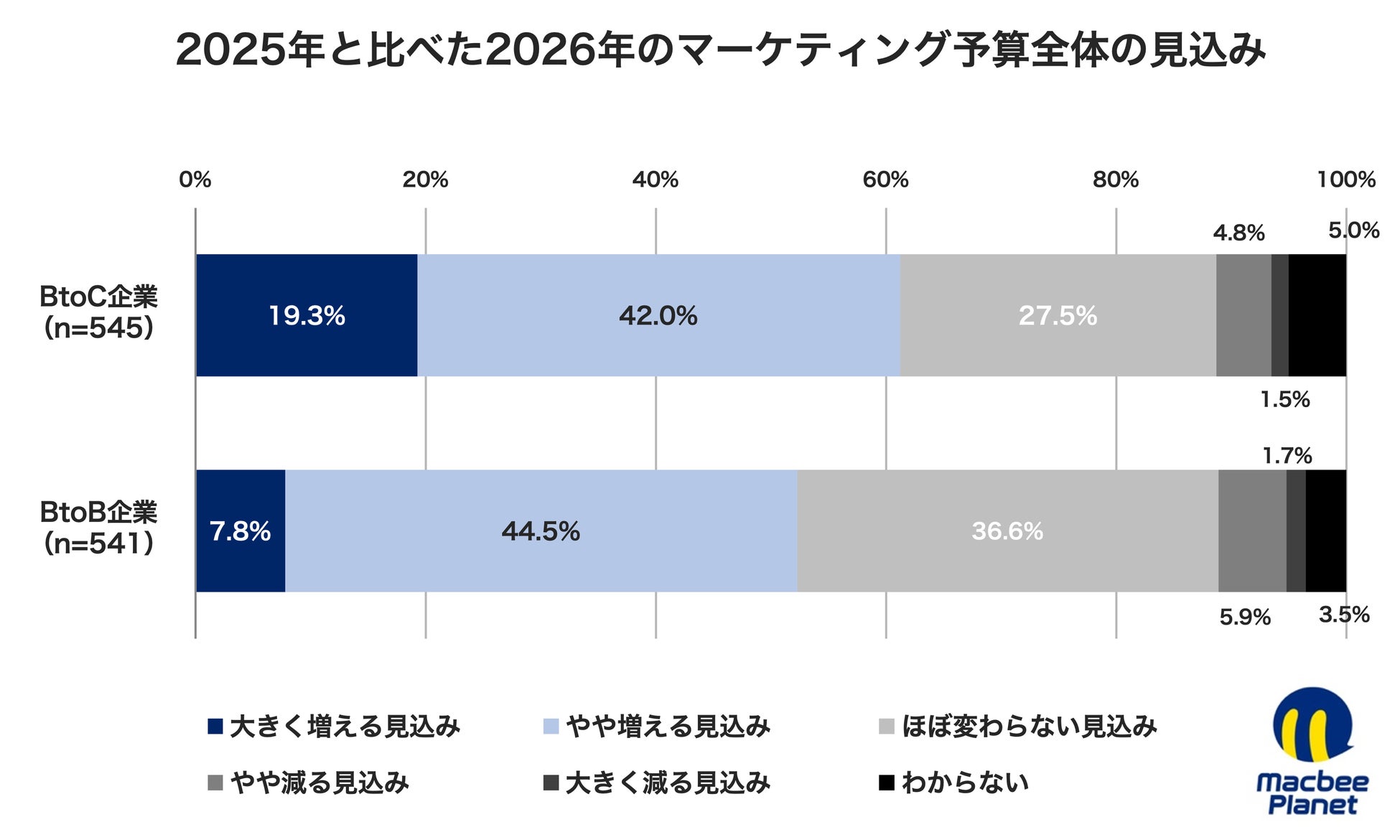 ▼2026年予算はBtoC企業が「拡大局面」、BtoB企業は「横ばい〜微増」が中心