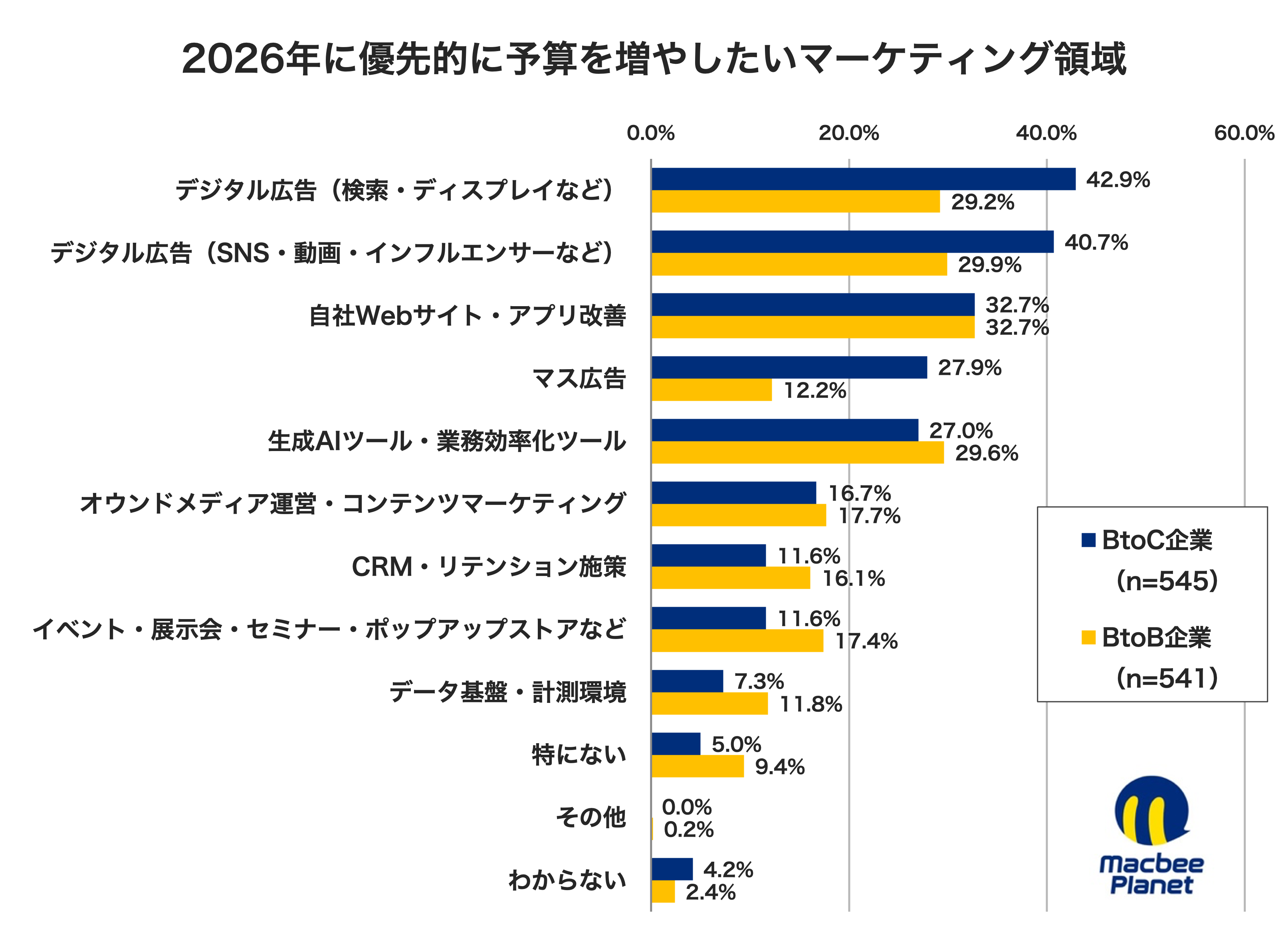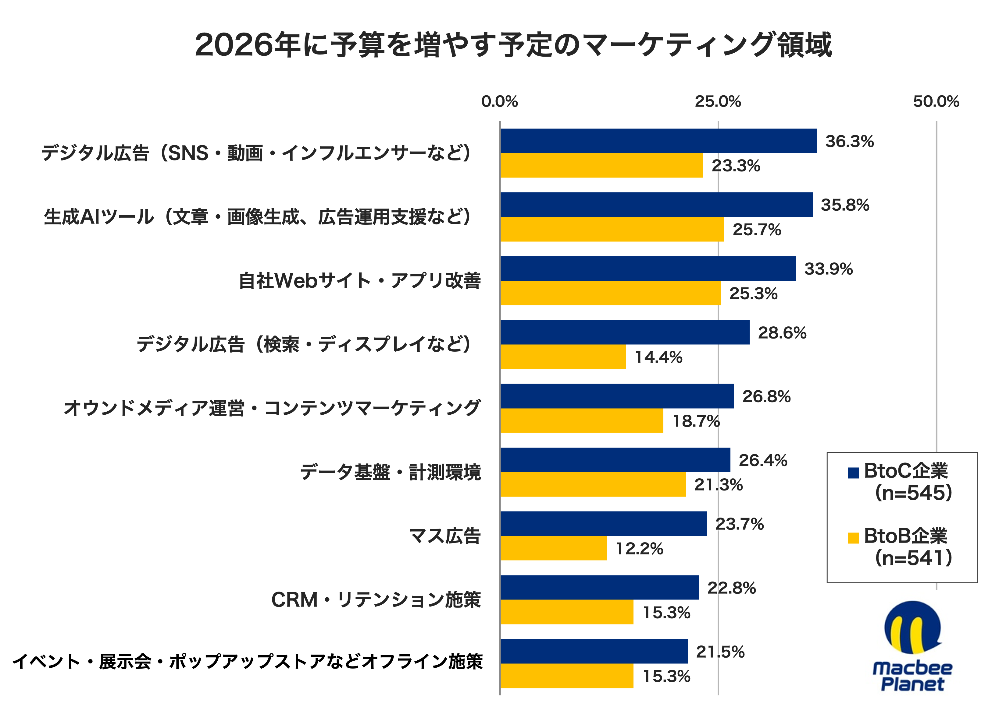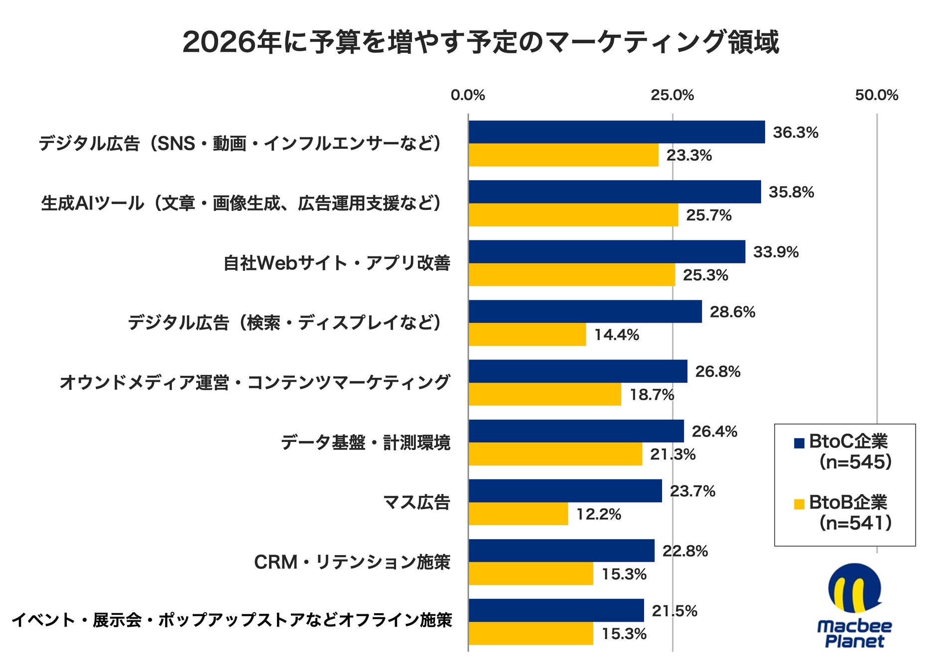 「2026年に増やす予定」はBtoC企業が広範でBtoB企業を上回る。“生成AIツール・業務効率化ツール”や“デジタル広告(SNS・オンライン動画・インフルエンサー施策など)”が上位に