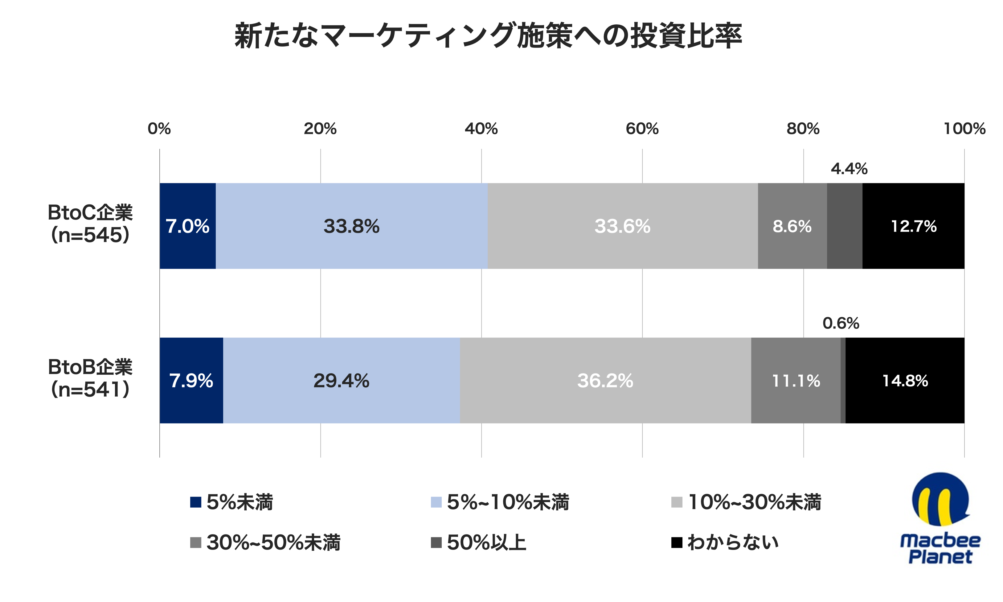また、新規施策・新技術導入など「新たに実施する取り組み」への投資比率は、BtoC企業で「50%以上」(4.4%)がBtoB企業(0.6%)を上回りました。BtoC企業は拡大局面の中で、新規投資に振り向ける余地が相対的に大きい傾向が見られます。