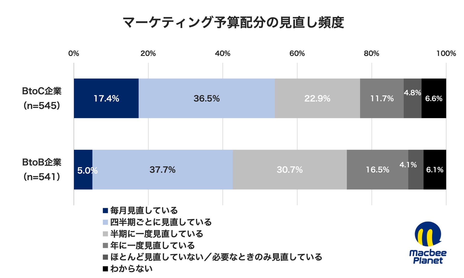 また、予算配分の見直し頻度は、BtoC企業で“毎月見直している”(17.4%)がBtoB企業(5.0%)を上回りました。BtoC企業は運用のサイクルが速い一方、見直し時に参照する情報として“広告管理画面の成果指標”(37.1%)がBtoB企業(20.8%)より高く、短期KPIに寄りやすい運用構造と言えそうです。