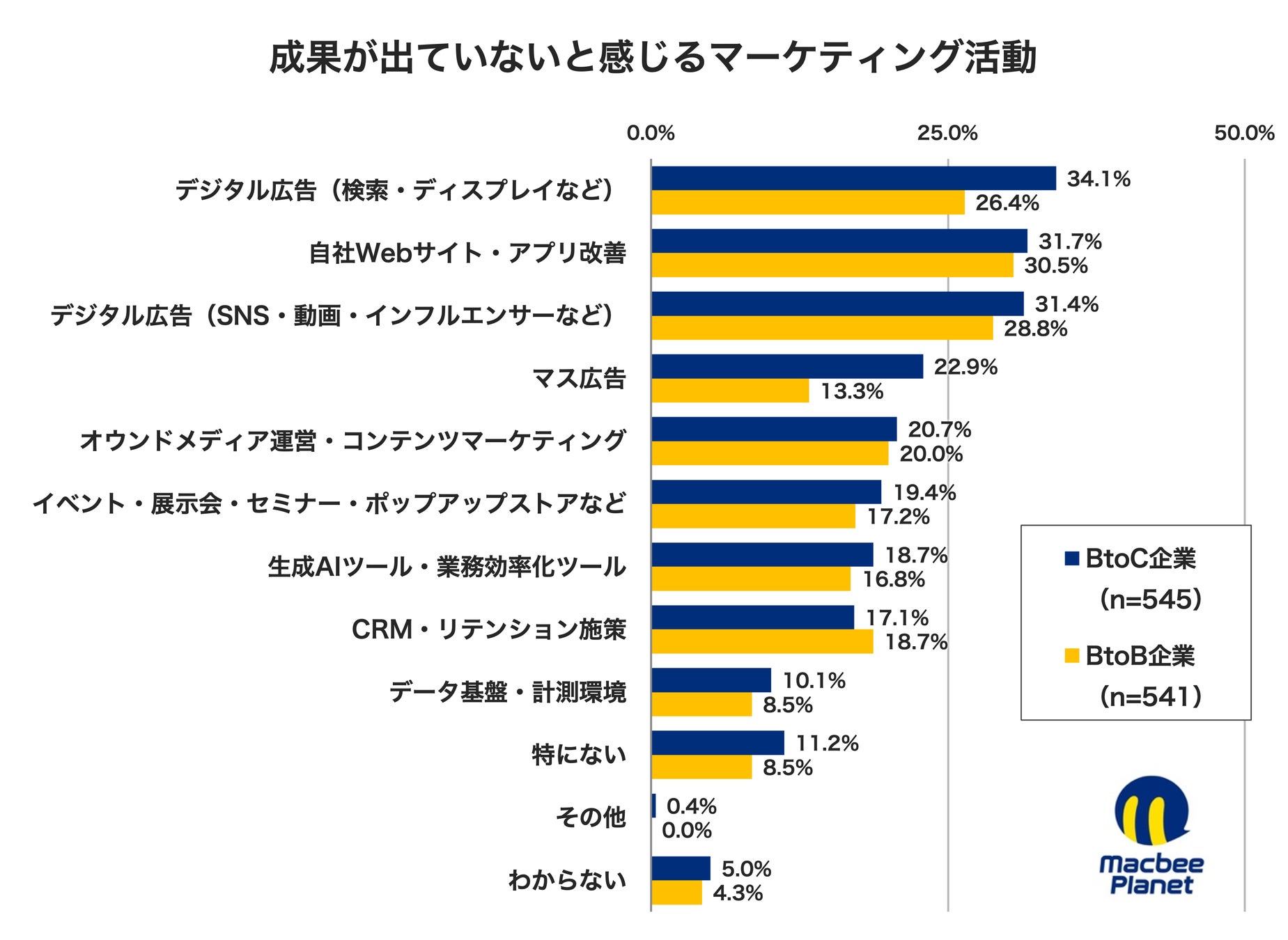 一方で「成果が出ていないと感じる領域」では、BtoC企業は“デジタル広告(検索・ディスプレイなど)”(34.1%)や“自社Webサイト・アプリ改善”(31.7%)が上位です。BtoB企業でも「自社Webサイト・アプリ改善」(30.5%)、“デジタル広告(SNS・オンライン動画・インフルエンサー施策など)”(28.8%)などが挙がっており、注力領域ほど“成果の説明責任”が問われやすい傾向が見られます。