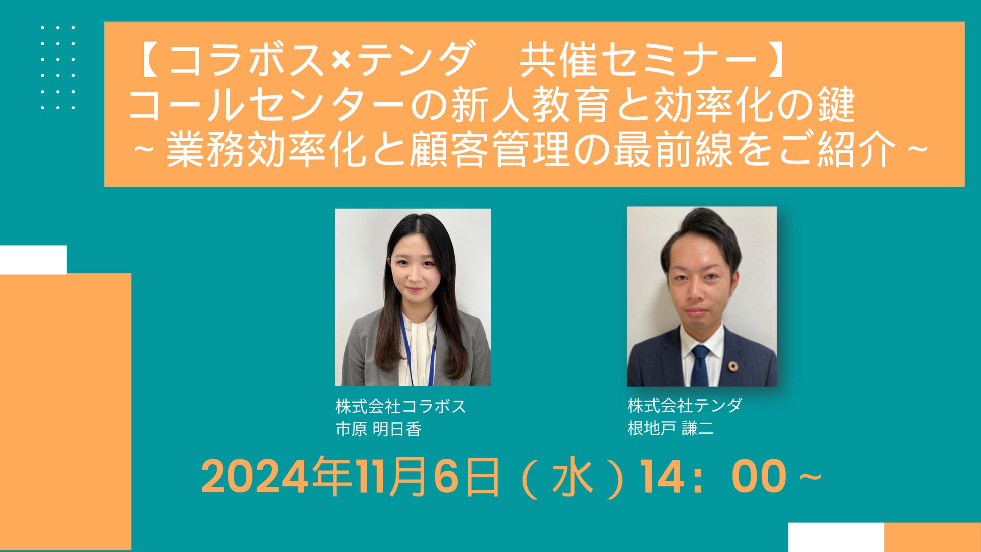 マニュアルトータルソリューションを提供する株式会社テンダ(本社/東京都渋谷区、代表取締役会長/小林 謙、以下「テンダ」)は、株式会社コラボス(本社/東京都千代田区、代表取締役社長/茂木 貴雄、以下「コラボス」)と、2024年11月6日(水)に「コールセンターの新人教育と効率化の鍵~業務効率化と顧客管理の最前線をご紹介~」と題し、共催ウェビナー(事前登録制・参加無料)を開催いたします。