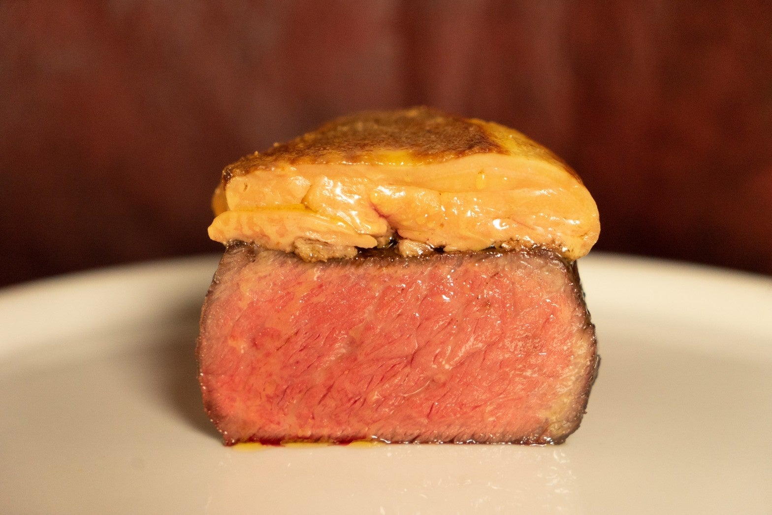旨味爆発、肉厚フォアグラと黒毛和牛の薪焼ステーキが一皿に集結。