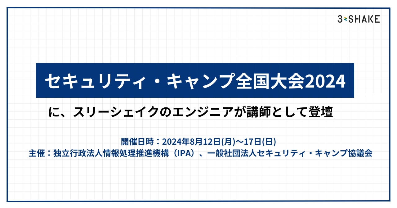 株式会社スリーシェイク(本社:東京都新宿区、代表取締役社長:吉田 拓真、以下スリーシェイク)に在籍するエンジニアが、独立行政法人情報処理推進機構と一般社団法人セキュリティ・キャンプ協議会が共催する「セキュリティ・キャンプ全国大会2024」に講師として登壇することをお知らせいたします。