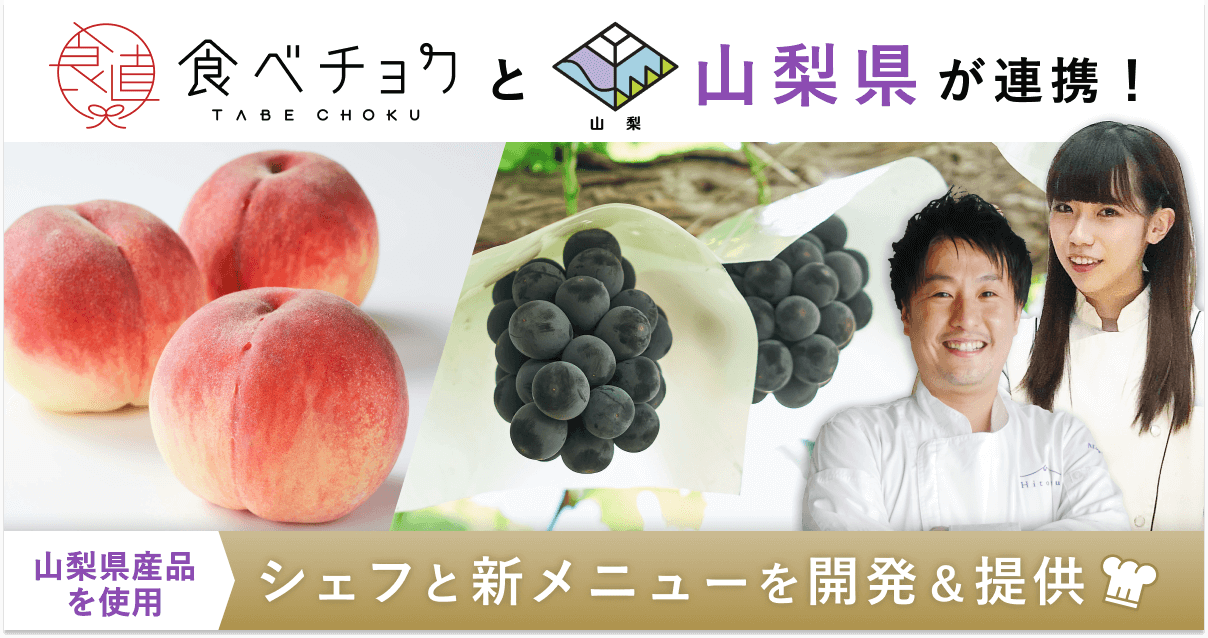 食べチョクが山梨県と連携。シェフと新メニューを開発し、店舗で山梨県産品の料理とスイーツを提供。ウェブとリアルを掛け合わせた生産者のファンづくりをサポート。