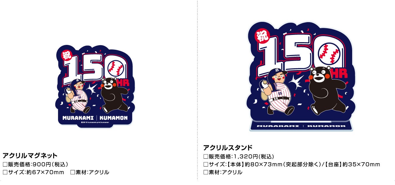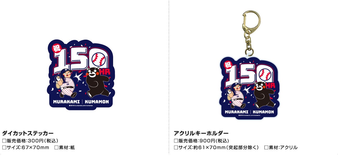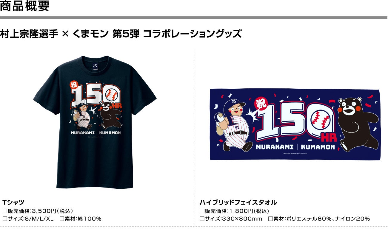 熊本県出身の村上選手150号本塁打達成を記念し、熊本県営業部長兼しあわせ部長「くまモン」とのコラボレーション企画第5弾が実現しました。今回発売する商品は、Tシャツ、フェイスタオル、アクリルキーホルダー、アクリルスタンド、マグカップ、ステッカーの7 種とラインナップも盛りだくさんになっています。