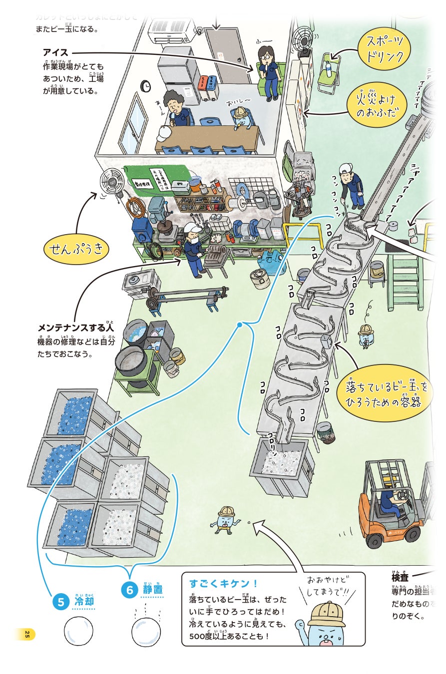 新刊『工場大ずかん つくりかたしり隊がいく!』は、私たちが実際にそれぞれの工場に取材に行って描きました。どの工場にも、1つの物を作るのにいろんな工夫があり、びっくりしました。ちなみに個人的におすすめなのはビー玉工場です。長いレールでころころ転がしてビー玉を冷やしたり、工場内が暑いのでアイスが支給されていたり、おもしろポイントが満載です!!