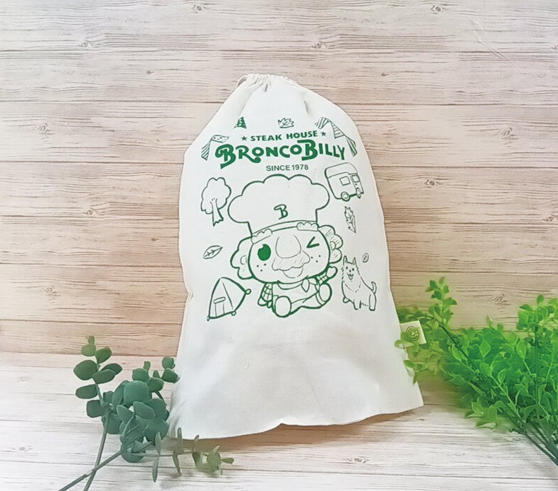 ブロンコビリー羽生noNIWA店ではオープン記念として、先着1,000名様の数量限定で、ご来店いただいた方の中で、アプリ・キッズ会員に新規で登録いただいた方、もしくはアプリ・キッズ会員にすでにご登録いただいている方に、オリジナルデザインのノベルティの配布を行います。ブロンコビリーを身近に感じていただきたいという思いから、普段使いできる巾着をご用意いたしました。